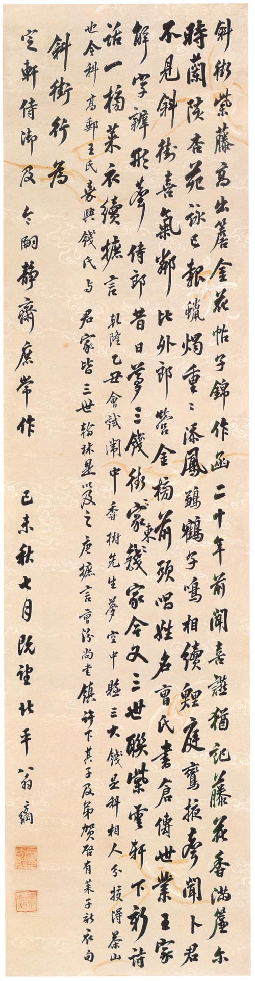 释文:斜街紫藤高出簷,金花帖子锦作函。二十年前闻喜讌,犹记藤花香满帘。尔时兰陔杏苑