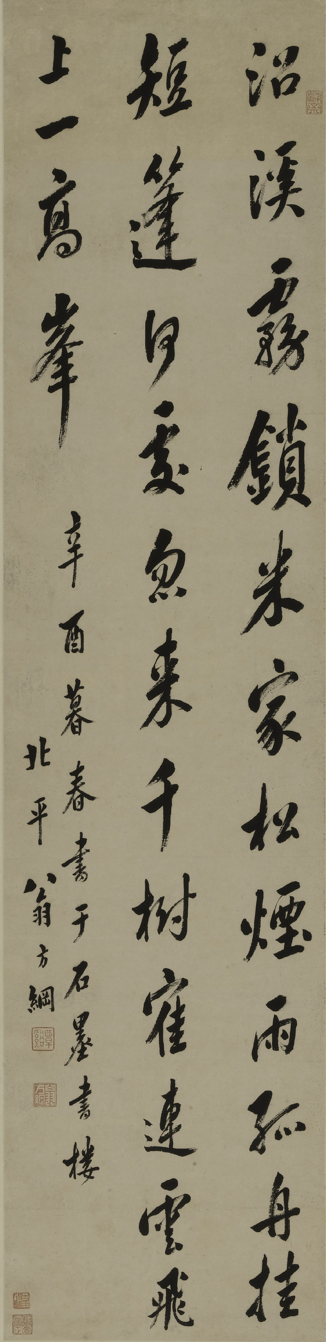 释文:沼溪雾锁米家松,烟雨孤舟挂短篷。何处忽来千树鹤,连云飞上一高峰。 款识:辛酉暮春书于石墨书楼,北平翁方纲。 此轴用笔含蓄圆厚,结体严谨匀称,时见跳荡之姿。书于嘉庆六年(1801),时年六十九岁。