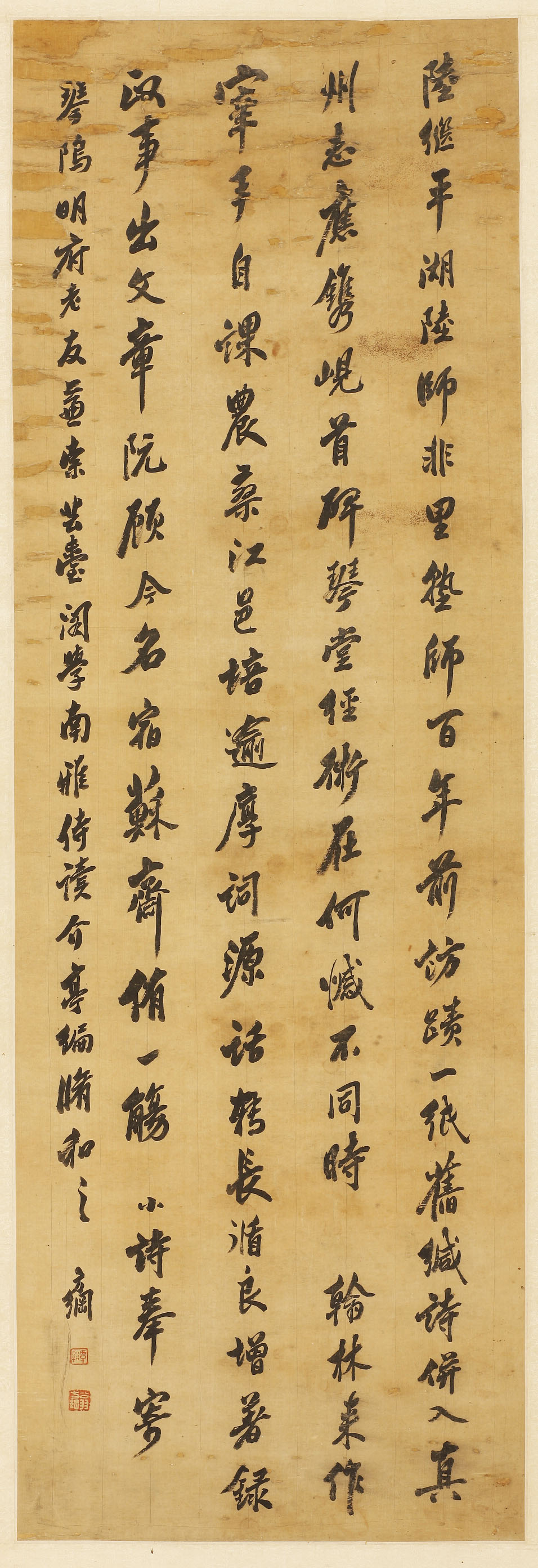 释文:陆继平湖陆,师非里塾师。百年前访迹,一纸旧缄诗。并入真州志,应镌岘首碑。琴堂经术在,何憾不同时。 翰林来作宰,手自课农桑。江邑培逾厚,词源话转长。循良增著录,政事出文章。阮顾今名宿,苏 斋侑一觞。 款识:小诗奉寄琴坞明府老友,兼索芸台阁学南雅侍读介亭编修和之,方纲。 钤印:覃溪、翁方纲