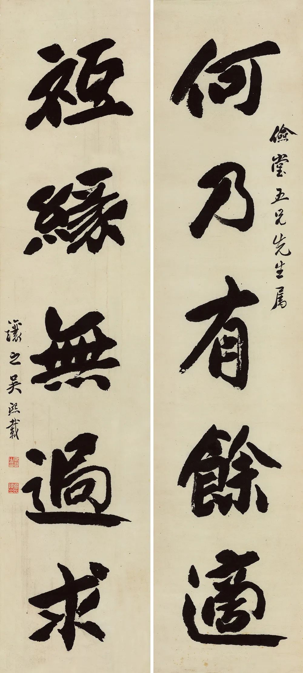吴熙载《行楷书“何乃只缘”五言联》纸本行楷书 157.5×35.5cm×2 江苏省美术馆藏