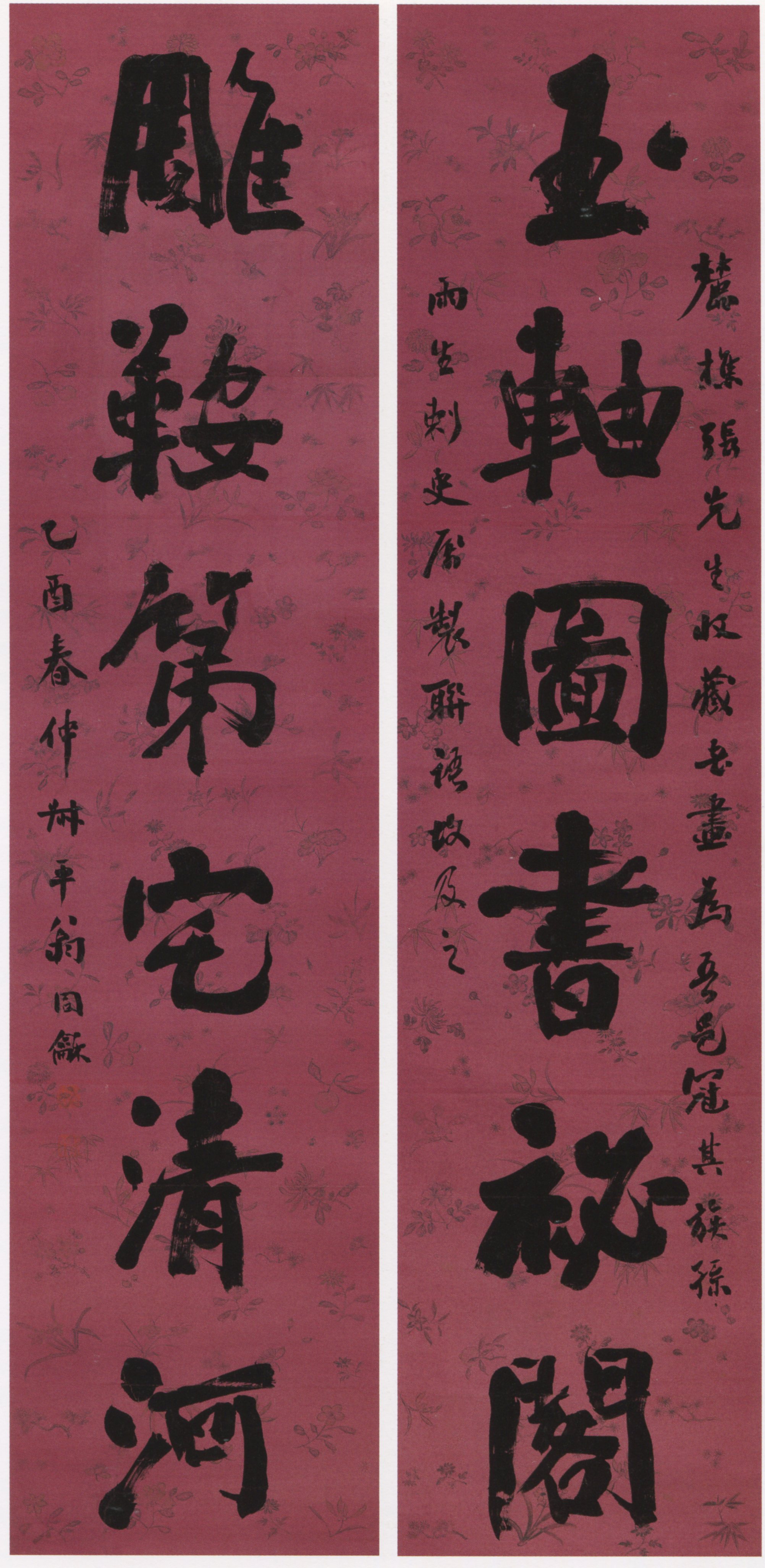 释文:玉轴图书密阁,雕鞍第宅清河。 款识:麓樵张先生收藏书画为吾邑冠,其族孙雨生刺史属制联语,故及之。乙酉春仲,叔平翁同龢。 钤印:翁同龢印(白文)、叔平(朱文)