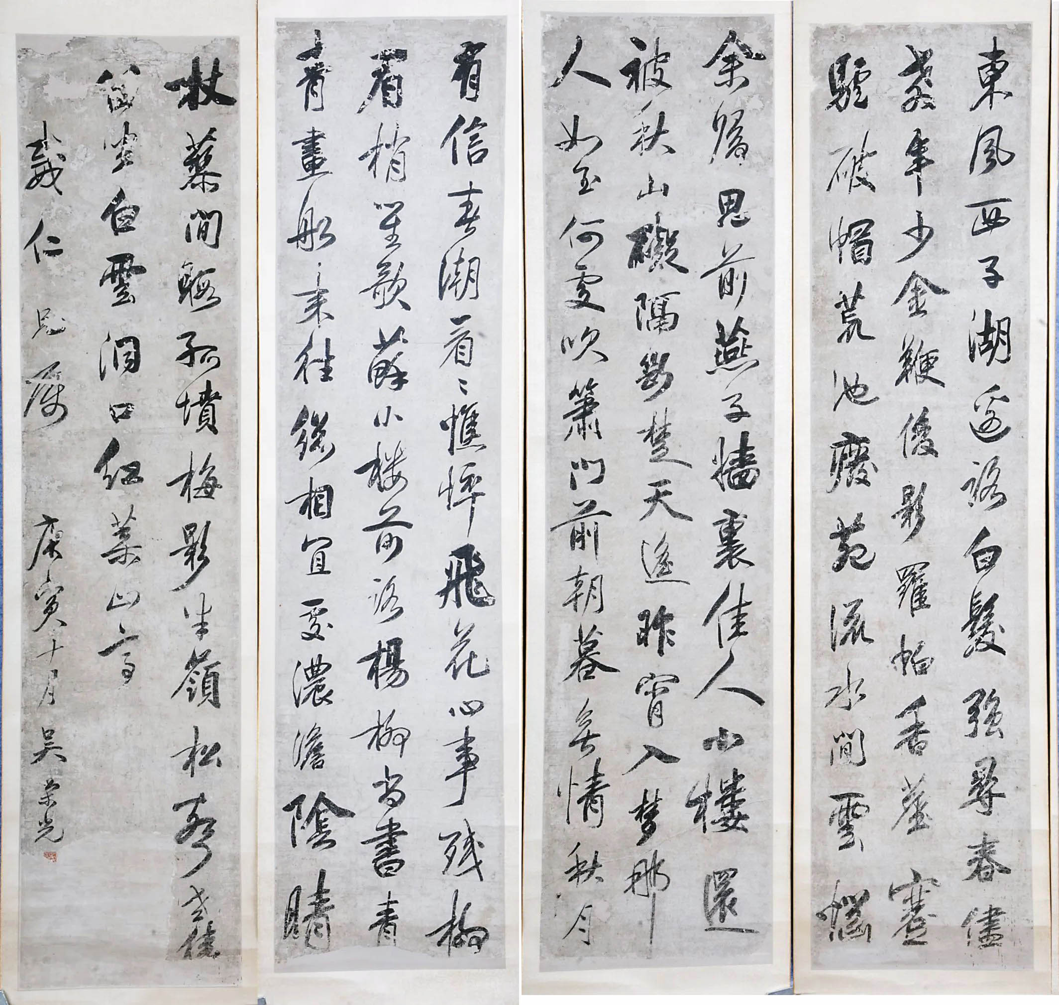 吴荣光自嘉庆二十三年(1818)离开北京至道光十年(1830年),因为职务变动而迁徙全国各地,历任陕西陕安道、福建盐法道、浙江按察使、贵州布政使等,阅历加深、见识益广,其书法也更为成熟,在取法前辈书家前提下有了自己独特的风格。此四屏作于道光十年(1830年)十月,字体雄健浑厚,字形笔法,变化有致,一气呵成,体现了吴荣光卓越的书法艺术成就,因此这件《吴荣光行书四屏》显得弥足珍贵。