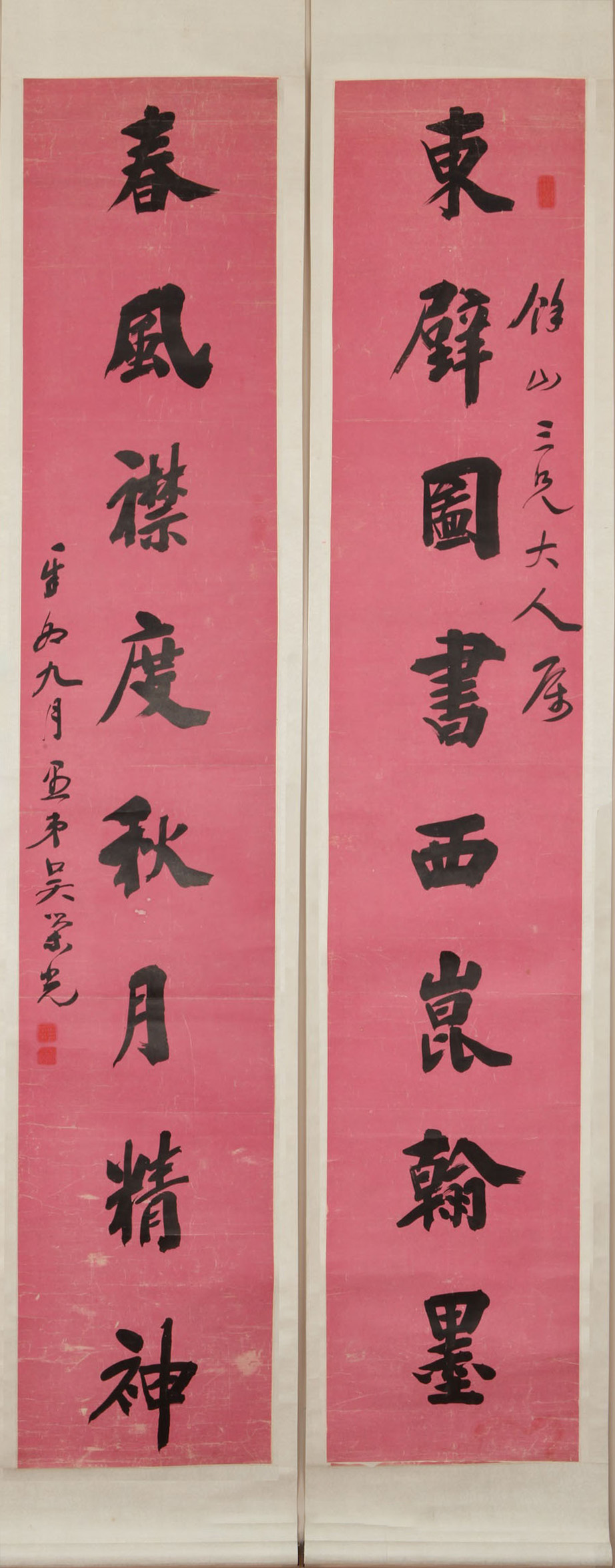 释文:东壁图书西昆翰墨,春风襟度秋月精神。 款署:余山三兄大人属,辛卯九月,愚弟吴荣光。