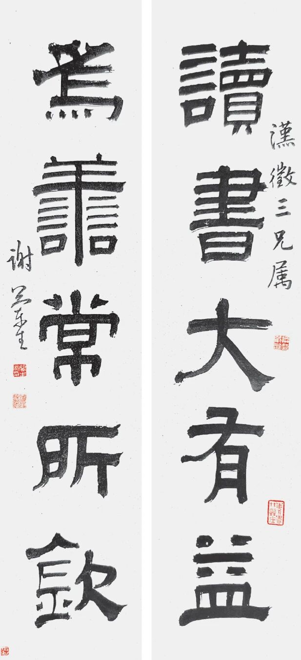 广东省博物馆藏其隶书“读书大有益,为善常所钦”五言联(如图),纸本,上联款识“汉徵三兄属”,下钤“唤起截断”白文、“美人香草之居”朱文印,下联署“谢兰生”,下钤“兰生私印”白文、“澧浦”朱文印。“唤起截断”出自《宋史·李道传传》:“……大书‘唤起截断’四字,知其用功,慎独如此。”“美人香草”语,出自汉代王逸《离骚序》。两印文当为勉励自己治学要用功慎独,做人要有忠君爱国的情怀。