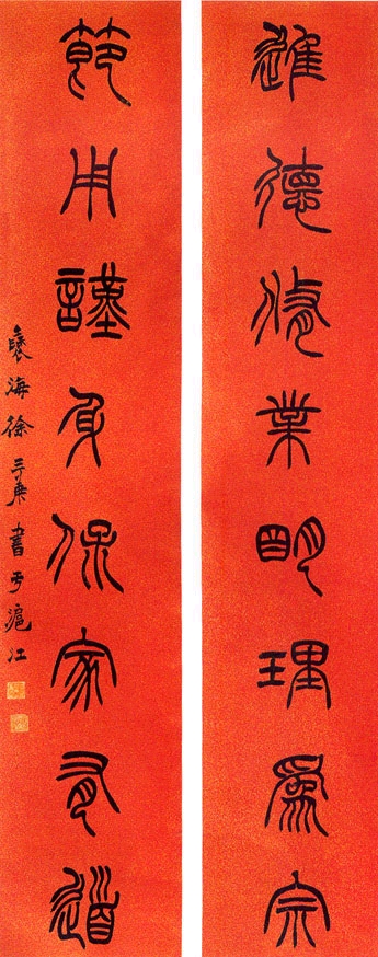 释文:进德修业明理为宗,节用谨身保家有道。 款 识:袖海徐三庚书於沪上。 钤印:徐三庚之印信(白文)、袖海(朱文)