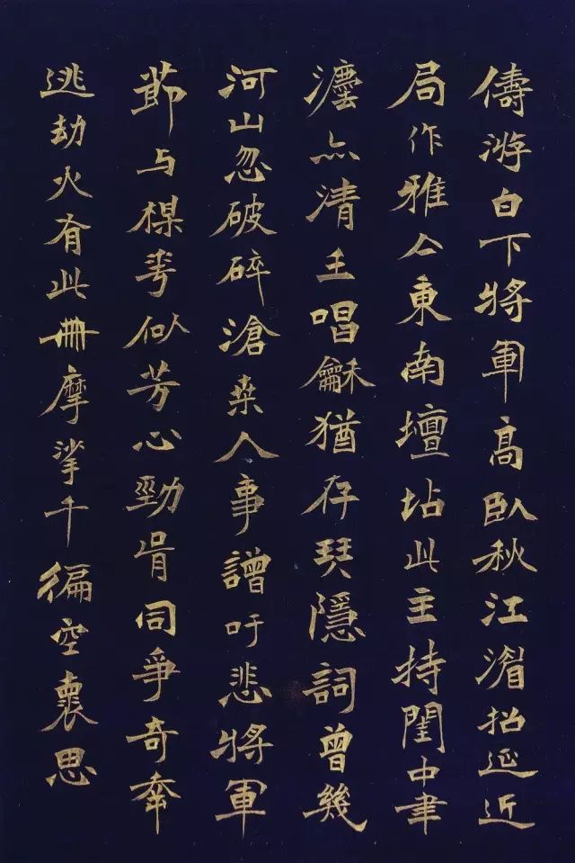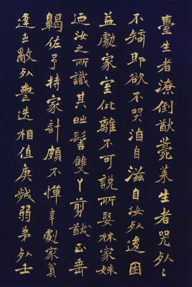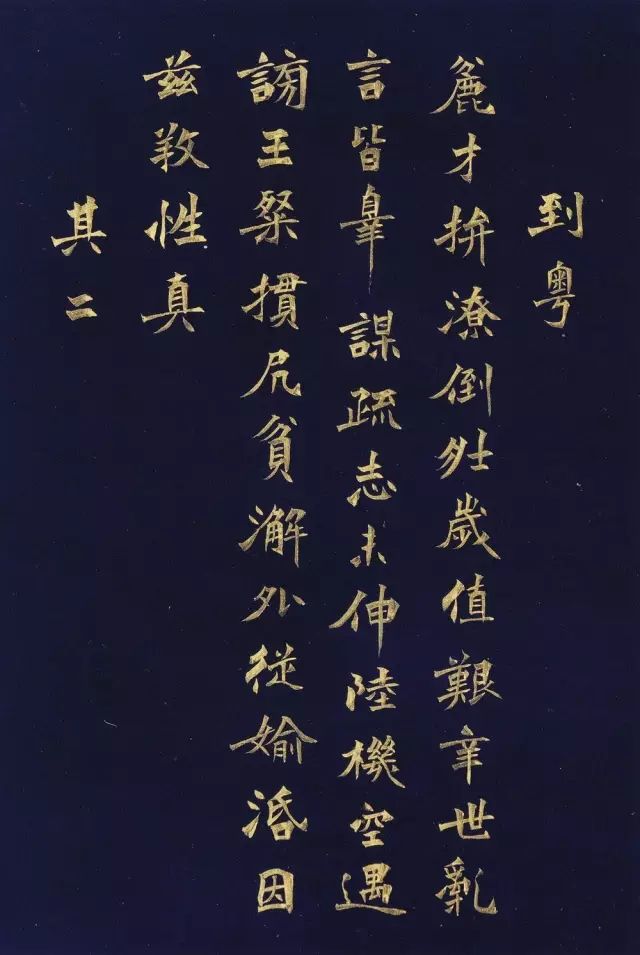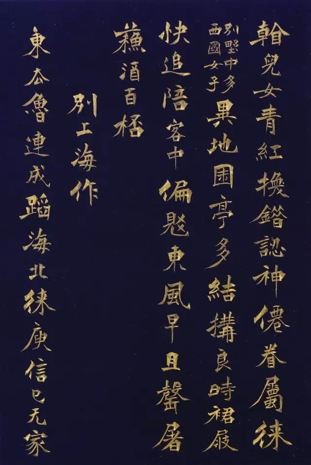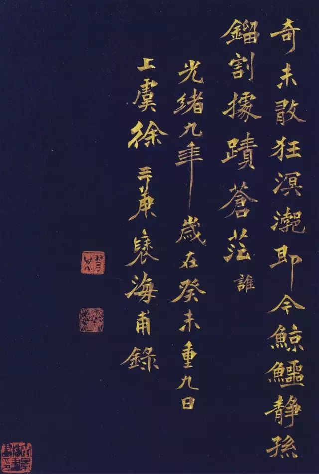 此楷書冊,正文十六開,跋一開。單頁縱三二點五厘米,橫二一點八厘米。一九〇行,計二一六四字。光緒九年(一八八三年),徐氏五十八歲時所書。藍紙和金液的結合,行遠字近的章法,大小參差的字形,收放自如的結體、靈活多變的用筆,展現了徐氏魏楷纖穠華麗、清俊秀逸的書風。
