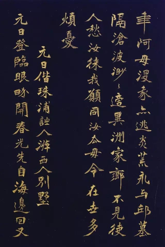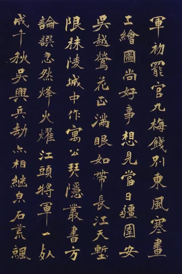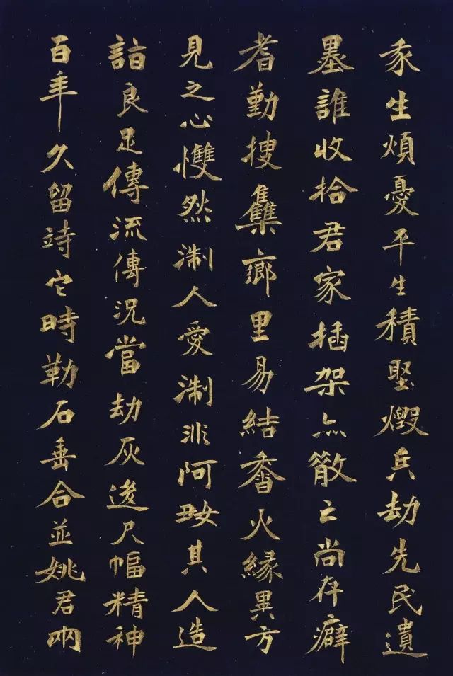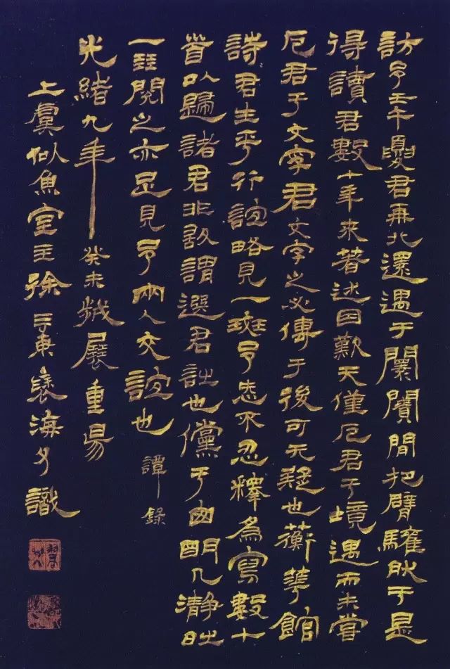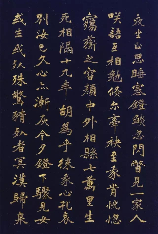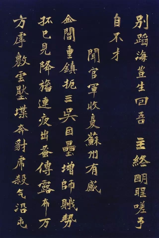此楷書冊,正文十六開,跋一開。單頁縱三二點五厘米,橫二一點八厘米。一九〇行,計二一六四字。光緒九年(一八八三年),徐氏五十八歲時所書。藍紙和金液的結合,行遠字近的章法,大小參差的字形,收放自如的結體、靈活多變的用筆,展現了徐氏魏楷纖穠華麗、清俊秀逸的書風。