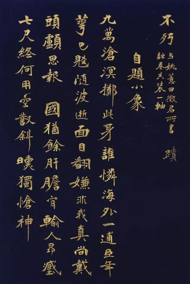 不朽。与姚薏田徵君所書詩卷共裝一軸。蹟補前文所缺。 《自題小像》 九萬滄溟擲此身,誰憐海外一逋臣。年 華己覺随波逝,面目翻嫌非我真。尚戴 頭顱思報國,猶餘肝膽肎輸人。昂藏 七尺終何用,空對斜曛獨愴神。