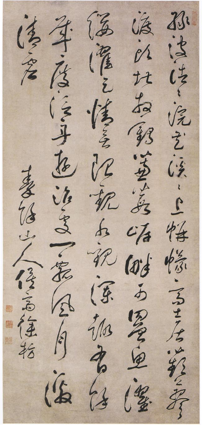 徐枋《草书七律诗轴》 151×69.6cm 苏州博物馆藏 释文:绿波浩浩浣花溪,溪上帲幪高士居。苹蓼渡头堪放鹤,帘蘩岸畔可罾鱼。濯缨濯足情无限,观水观澜趣有余。几度泛舟游沼处,一瓢风月激清虚。 款署:秦馀山人俟斋徐枋。 钤印:雪休庵(朱文)、居易俟念(白文)、徐枋之印(白文)、俟斋(朱文) 【资料来源】《苏州博物馆藏明清书画》(文物出版社)