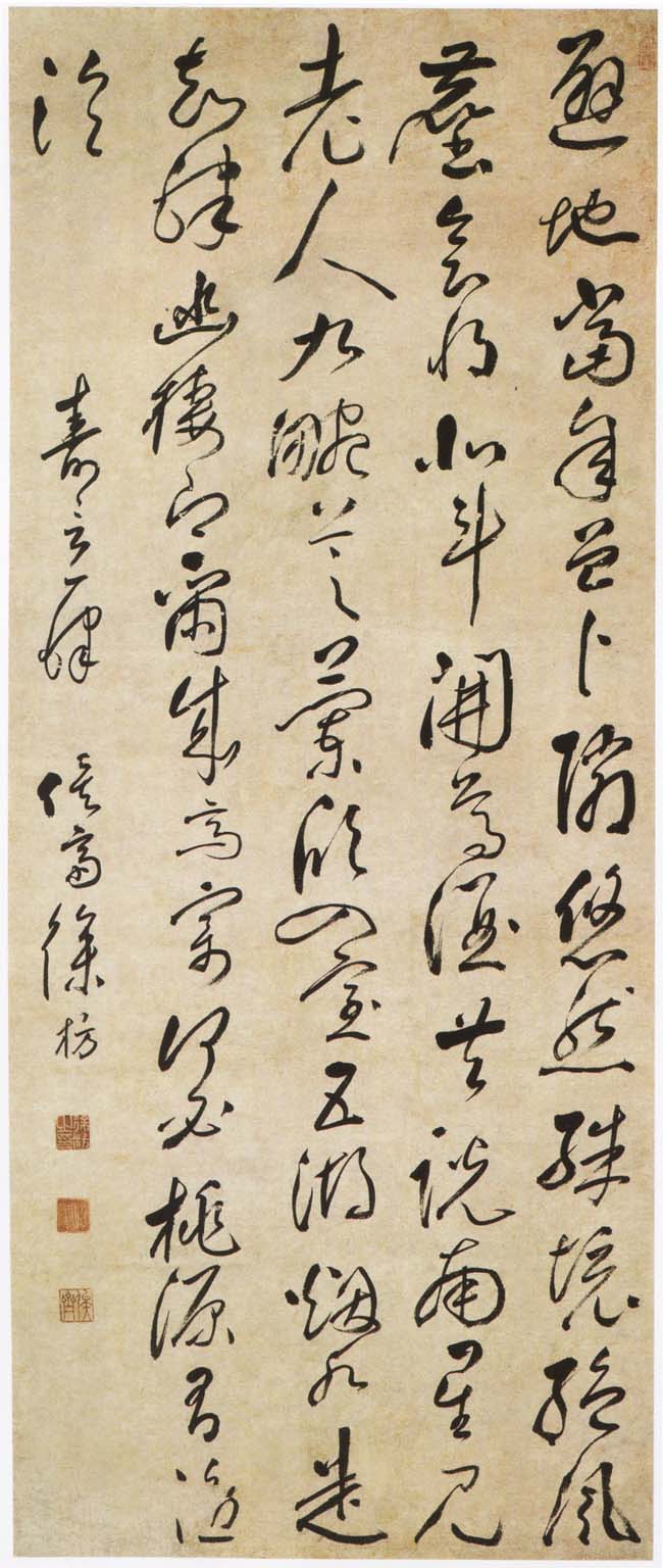 徐枋《草书寿言诗轴》纸本草书 134.5×58cm 浙江省博物馆藏 释文:避地当年曾卜邻,悠然殊境绝风尘。会将北斗开尊酒,共说南星见老人。九畹芝兰欣入室,五湖烟水走知□。幽栖向尔成斋寓,何必桃源有□□。 款署:寿言一律,俟斋徐枋。 钤印:林庵(朱文)、徐枋之印(白文)、昭法(白文)、俟斋(朱文) 【资料来源】《浙江省博物馆典藏大系-翰墨清芬》(浙江古籍出版社)