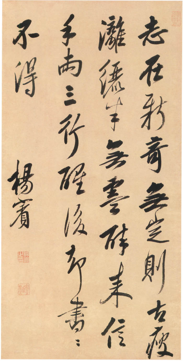 释文:志在新奇无定则,古瘦漓纚半无墨。醉来信手两三行,醒后却书书不得。 款识:杨宾。 钤印:杨宾之印(白文)、大瓢(朱文)、家在山阴道上(朱文) 【资料来源】《中国法书全集》16-清代书法1(文物出版社 可嘉扫描) 中国沈銓网