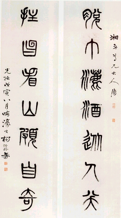 释文:脱巾洒酒从人笑,拄笏看山颇自奇。 款 识:湘舟尊兄大人属。光绪戊寅八月晦濠叟杨沂孙篆。 钤印:戊寅(朱文)、历劫不■(朱文)、杨沂孙印(白文)、特健草乐(朱文)