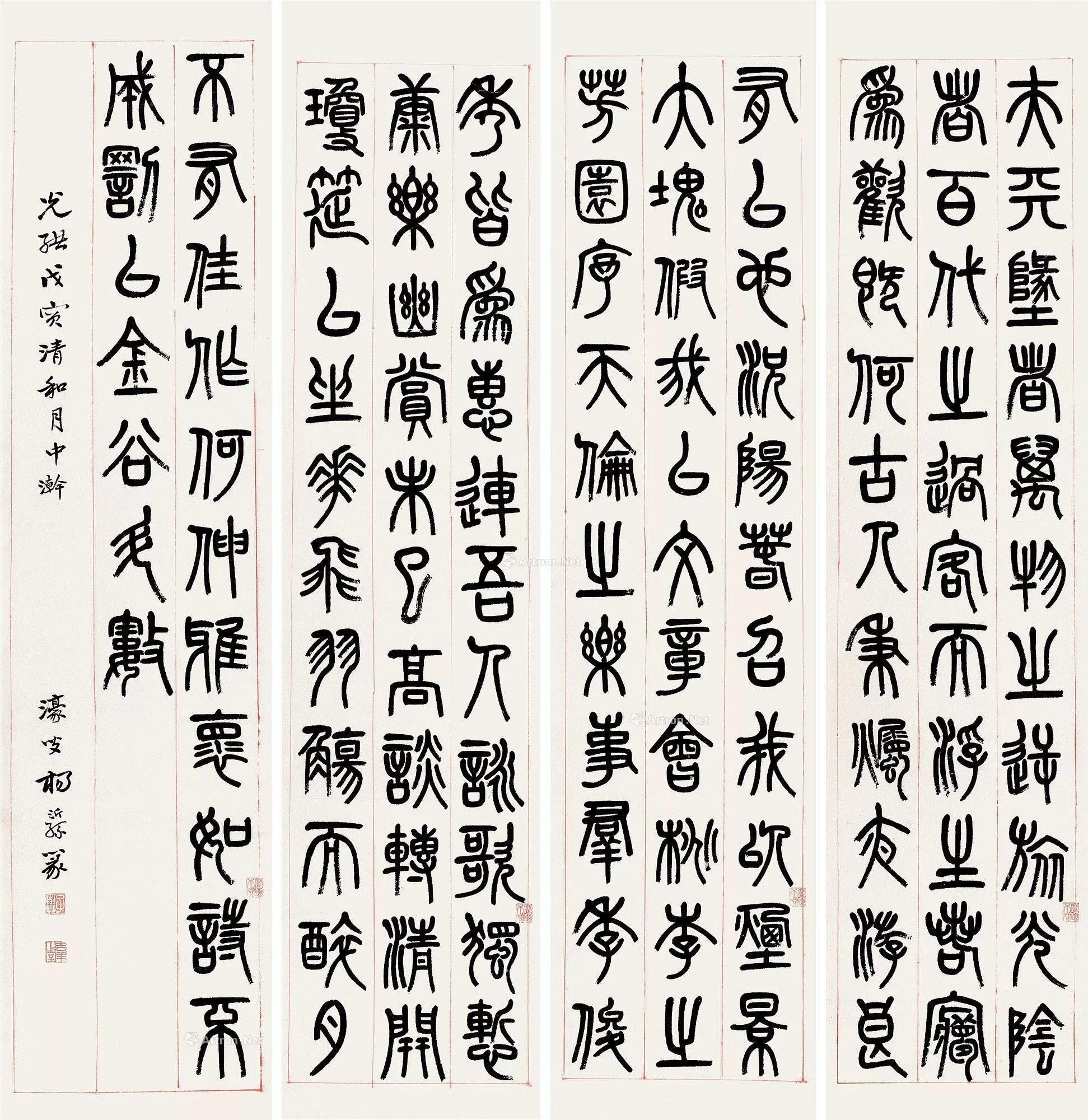 杨沂孙《篆书李白春夜宴诸从弟桃李园序四条屏》纸本 130×31cm×4 1878年 上海敬华拍卖