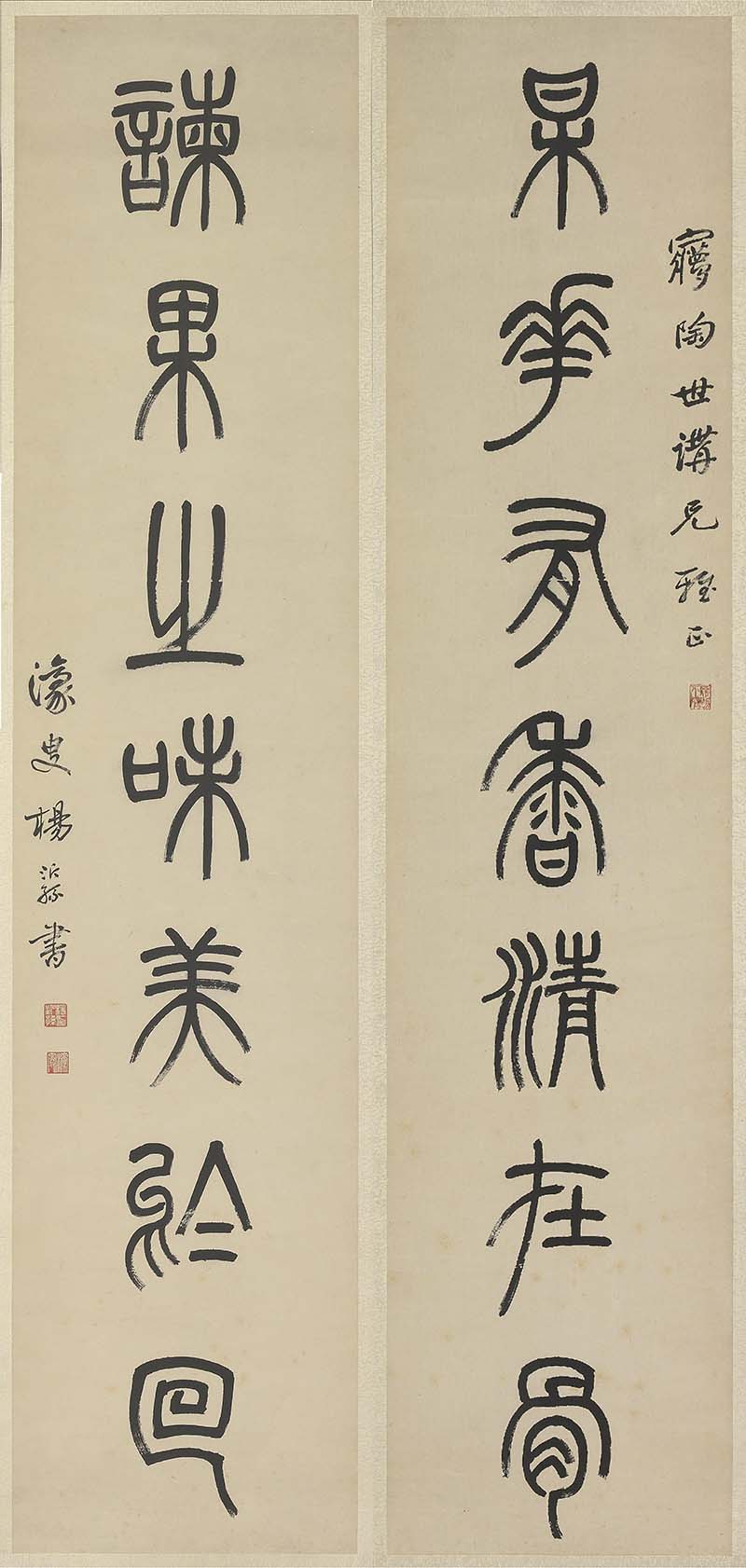 释文:梅花有香清在骨,谏果之味美于回。 款识:梦陶世讲兄雅正。濠叟杨沂孙书。 钤印:杨沂孙印(白文)、濠叟(白文)、历劫不磨(朱文) 此幅是杨沂孙为友人所作篆书对联,笔力苍劲,篆法精纯,结构严整,表现出其晚年篆书的成熟面貌。 (撰稿人:王亦旻)