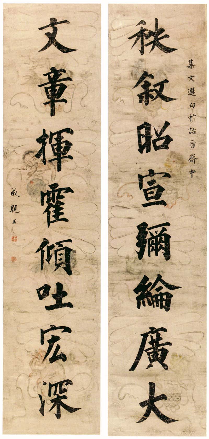 释文:秩叙昭宣弥纶广大,文章挥霍倾吐宏深。 款识:集《文选》句于诒晋斋中。成亲王。 钤印:成亲王(白文)、诒晋斋印(白文)