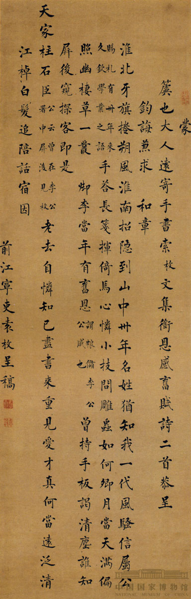 释 文:释文:蒙□也大人远寄手书,索枚文集,衔恩感旧,赋诗二首,恭呈钧诲,兼求和章。 淮北牙旗卷朔风,淮南招隐到山中。卅年名姓犹知我,一代风骚信属公(赐札有卅年来久钦学业之语)。手答长笺挥倚马,心怜小技问雕虫。如何卿月当天满,偏照幽栖草一丛。 御李当年有旧恩(谓粮储李公,公戚也),曾持手板谒清尘。谁知屏后窥探客,即是天家柱石臣。(公云曾在李公署中屏后见枚)。老去自怜知己尽,书来重见爱才真。何当远泛清江棹,白发追陪话宿因。 前江宁吏袁枚呈稿。
