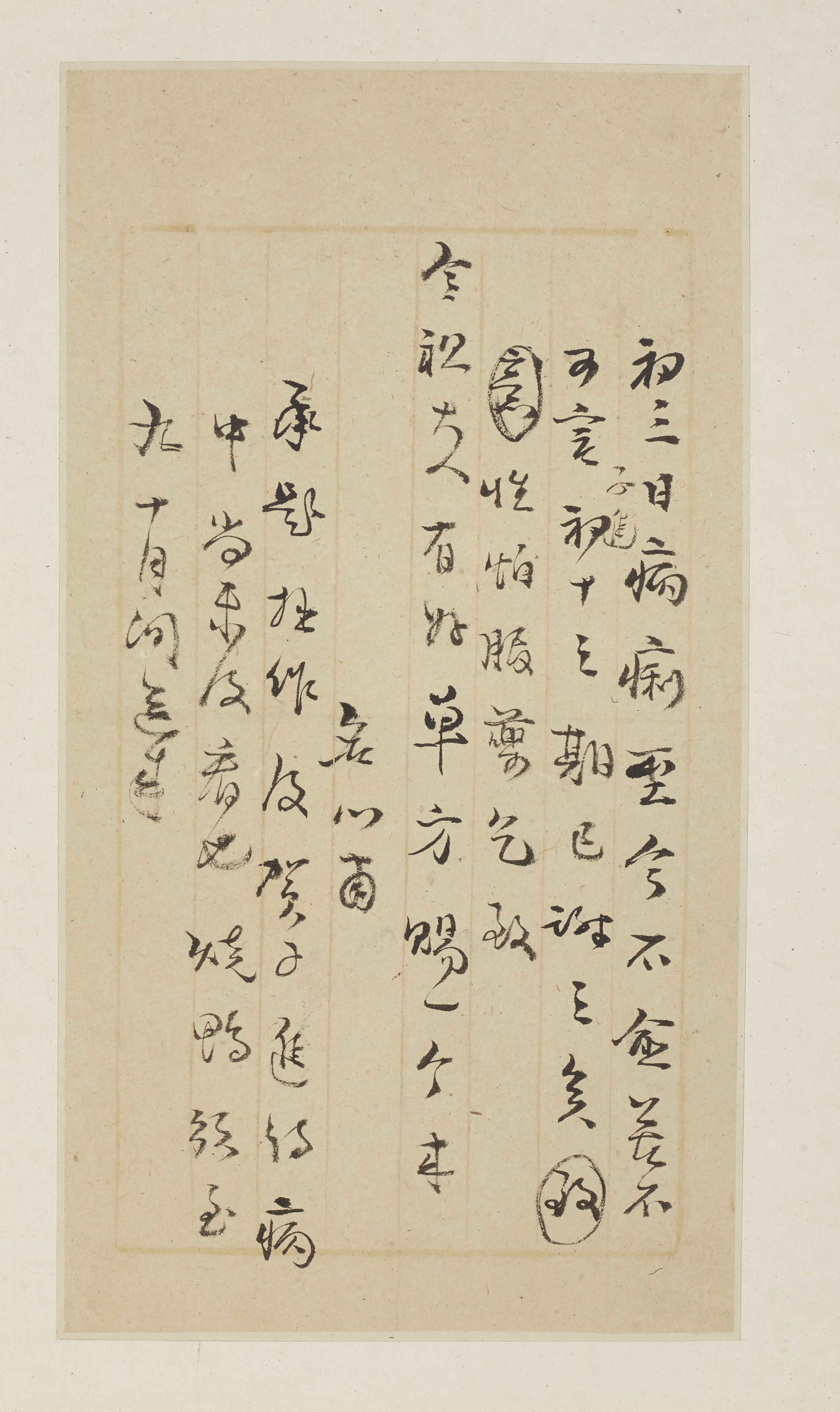 第七通释文:初三日,病痢至今不愈,苦不可言。子进初十之期已谢之矣,(致意)性怕服药,乞致令祖大人有好单方赐一个来,名心肃。承题拙作及贺子进诗,病中尚未及看也,烧鸭须至九十月间送来。