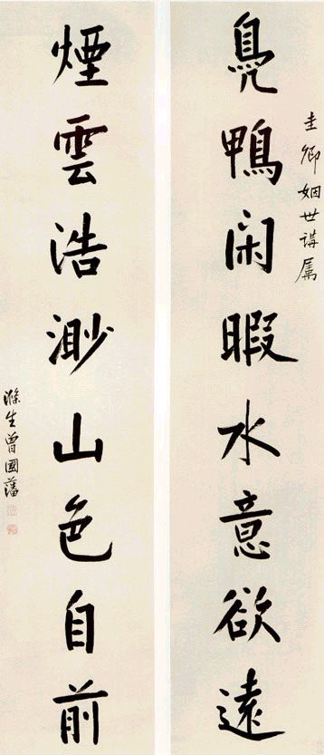 释文:凫鸭闲暇水意欲远,烟云浩渺山色自前。 款 识:圭卿姻世讲属,涤生曾国藩。 钤印:涤生(朱文)、曾国藩印(白文)