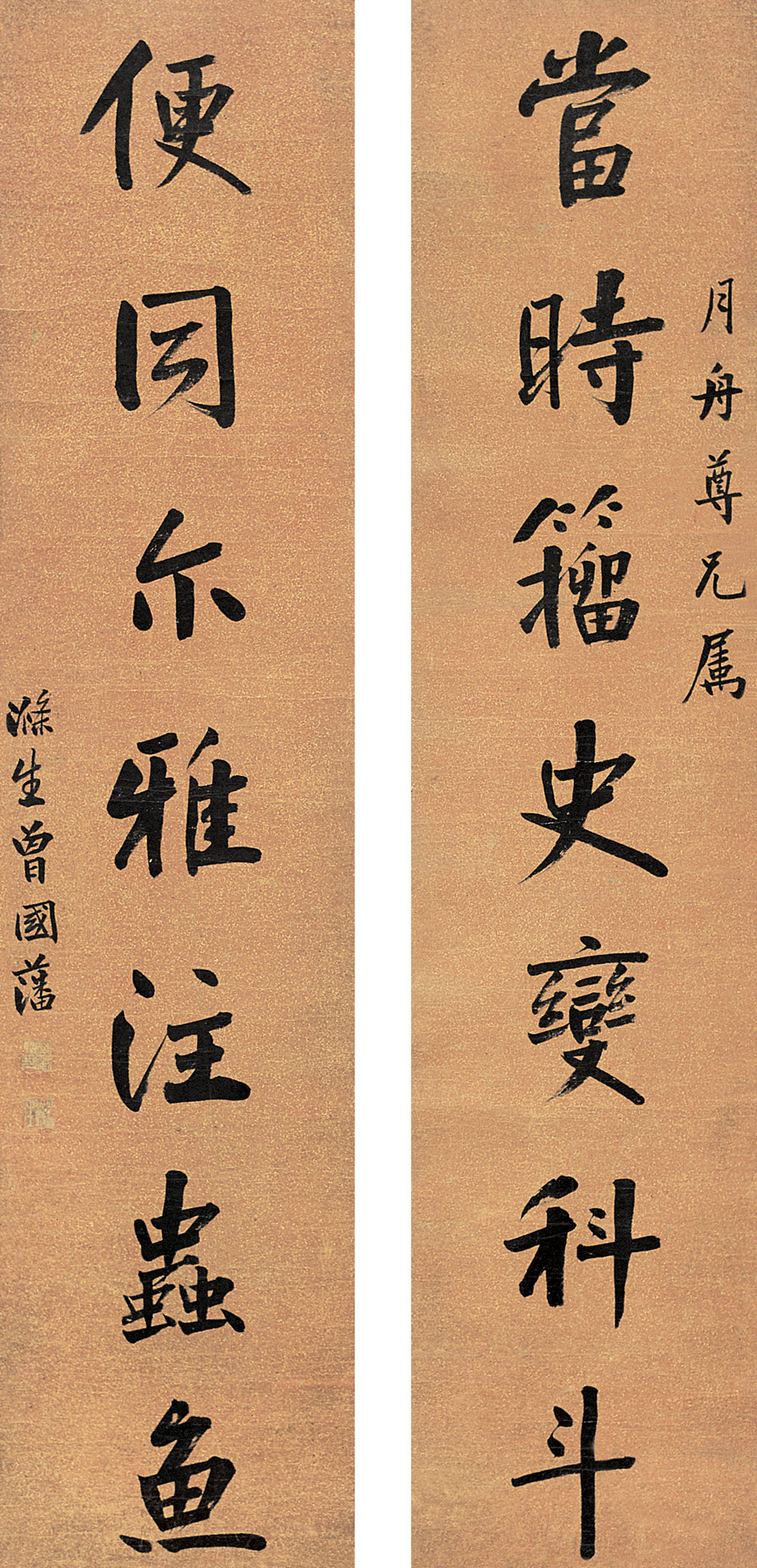曾国藩《“当时便同”七言联》洒金珊瑚笺行书 133×32cm×2 上海崇源艺术品拍卖有限公司 释文:当时籀史变科斗,便同尔雅注虫鱼。 款识:月舟尊兄属,涤生曾国藩。