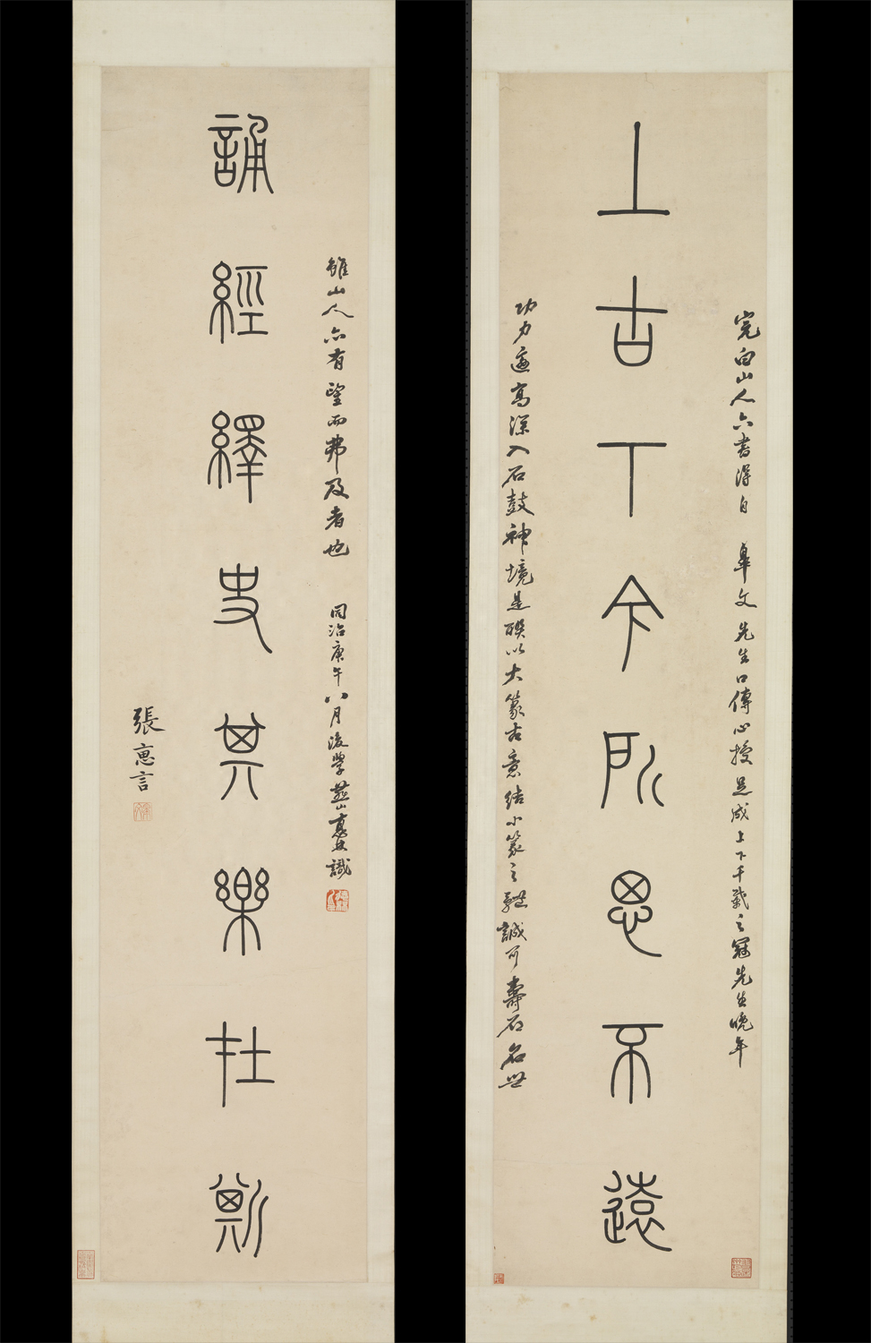 在书法的领域裡,张惠言氏同时以篆书见长,此幅书联,写来细劲如铁线,古意十足。本幅為谭伯羽、谭季甫先生昆仲捐赠予台北故宫。