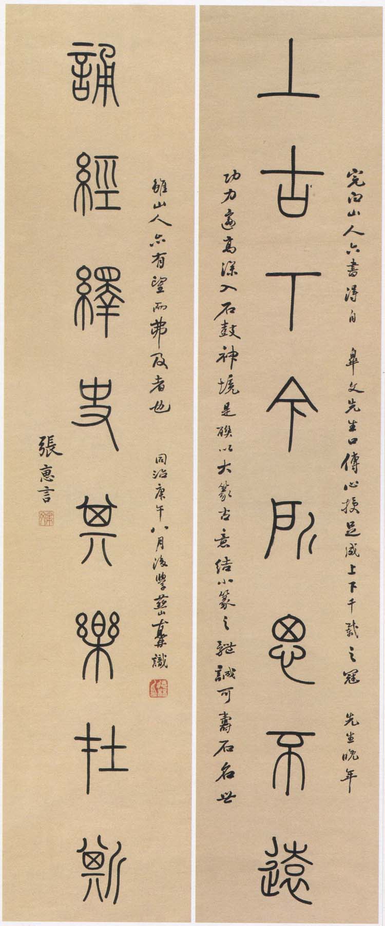 张惠言的诗词文章饮誉天下,他的书法却较鲜见,此篆书联弥足珍贵,款下钤有朱文“皋文”章,全联释文为“上古下今,所思不远,诵经绎史,其乐在斯”。其书工稳端庄,静默娴雅,加上他的题款行书亦很精彩,可窥其书风一斑。