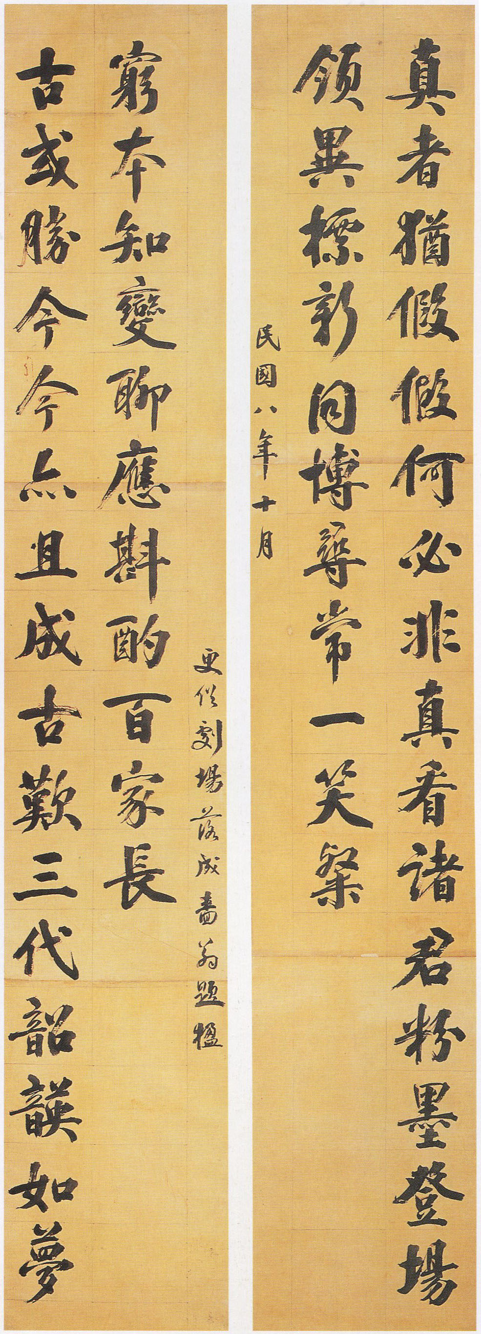 释文:真者犹假假何必非真看诸君粉墨登场领异标新同博寻常一笑粲, 古或胜今今亦且成古叹三代韶韺如梦穷本知变聊应斟酌百家长。 款署:民国八年十月,更俗剧场落成,啬翁题楹。