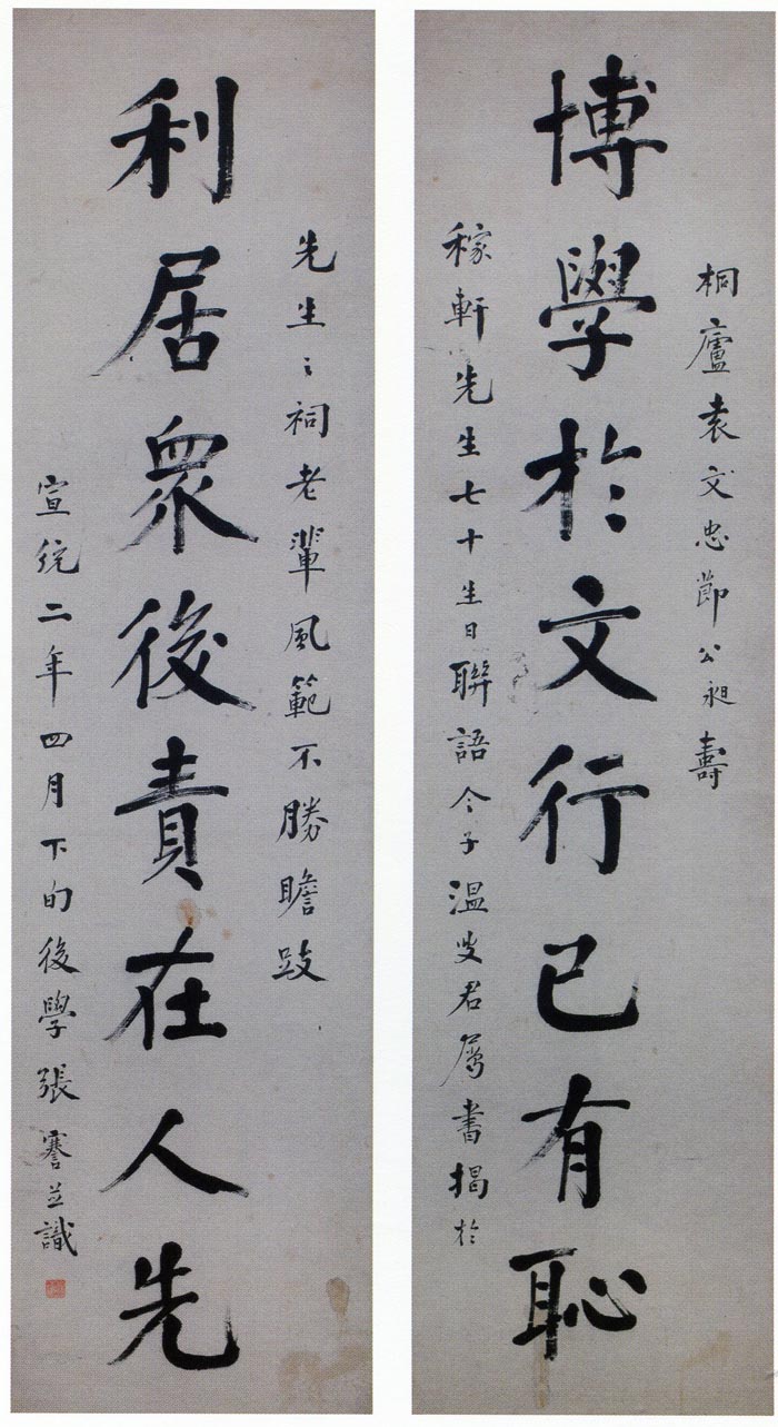 释文:博学于文,行已有耻;利居众後,责在人先。 款署:桐庐袁文忠节公昶寿,稼轩先生七十生日联语,令子温叟君属书,揭于先生之祠,老辈风范,不胜瞻跂。宣统二年四月下旬,後学张謇并识。