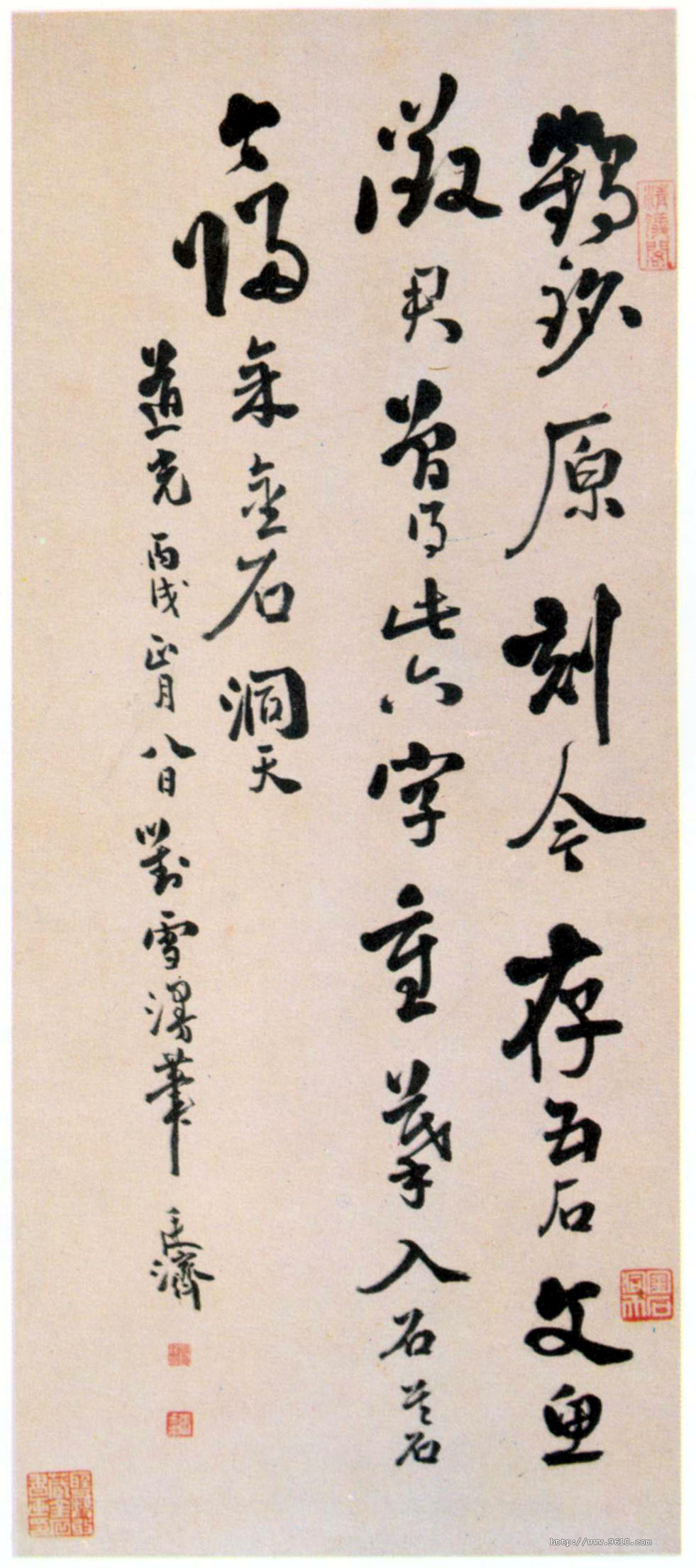 张廷济《跋瘗鹤铭语》纸本行书 109×45cm 吉林省博物馆藏 释文:鹤铭原刻今存五石,文鱼徵君曾得此六字,重摹入石,其石今归余金石洞天。 款署:道光丙戌正月八日对雪漫笔。廷济。 【资料来源】《中国美术全集》书法篆刻编-6-清代书法(可嘉提供)