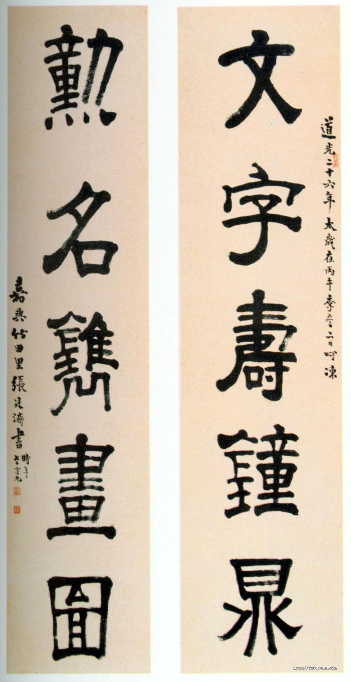 张廷济书法四体皆精。《五言联》为隶书作品,端庄宽博,沉厚挺拨,是其晚年代表之作。