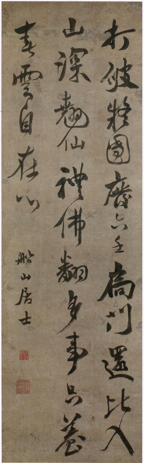 张问陶《行书七绝诗轴》纸本行书 125×40cm 淮安市博物馆藏 释文:打破疑团废六壬,扃门还比入山深。翘仙礼佛翻多事,只养春雲自在心。 款署:船山居士 钤印:司封郎中(白文)、龙蟠鹏逸(朱文) 【资料来源】《淮安市博物馆藏明清书画精品集 》 (文物出版社)
