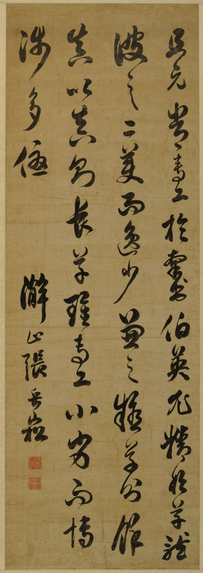 张岳崧《节临孙过庭书谱轴》 纸本草书 128×40cm 海南省博物馆藏 释文:且元常专工于隶书,伯英尤精于草体,彼之二美,而逸少兼之。拟草则馀真,比真则长草,虽专工小劣,而博涉多优。 款署:澥山,张岳崧。