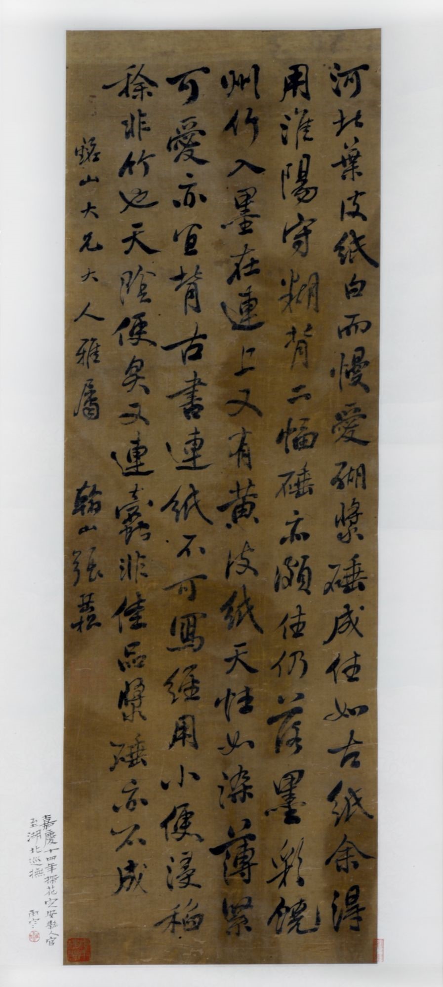 张岳崧《行书试河北叶皮纸轴》纸本行书 海南省博物馆藏 释文:河北叶皮纸白而慢,爱醐浆硾成,佳如古纸。余得用淮阳守糊背二幅,硾亦颇佳,仍落墨彩,饶州竹入墨在连上,又有黄皮纸,天性如染,薄紧可爱,亦宜背古书连纸,不可写经,用小便浸稻稌,非竹也。天阴便炙又连蠹,非佳品,浆硾亦不成。 款署:怪山大兄大人雅属,翰山张岳崧。