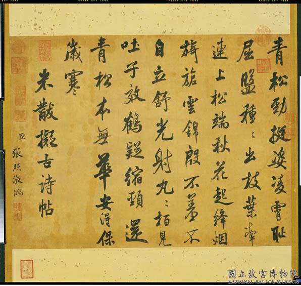 本幅是张照临米芾“蜀素帖-拟古诗帖”,与米芾《蜀素帖》比较,识者当能辨别高宗评论是否公允,抑或偏袒身边词臣。然,乾隆皇帝深爱张照的书法,则是不容置疑的,除了内廷收藏有丰富的张照墨迹可资佐证外,沈初《西清笔记》载:“张文敏尚书嗜饮,有醉中作书极得意者,内府所藏《临争坐帖》,自谓酒气拂拂,从十指间出,上甚赏之。”高宗爱其才,爱其名士风流,为张照诡谲多变的仕途,凭添了一份保障。《清国史馆张照本传》论曰: