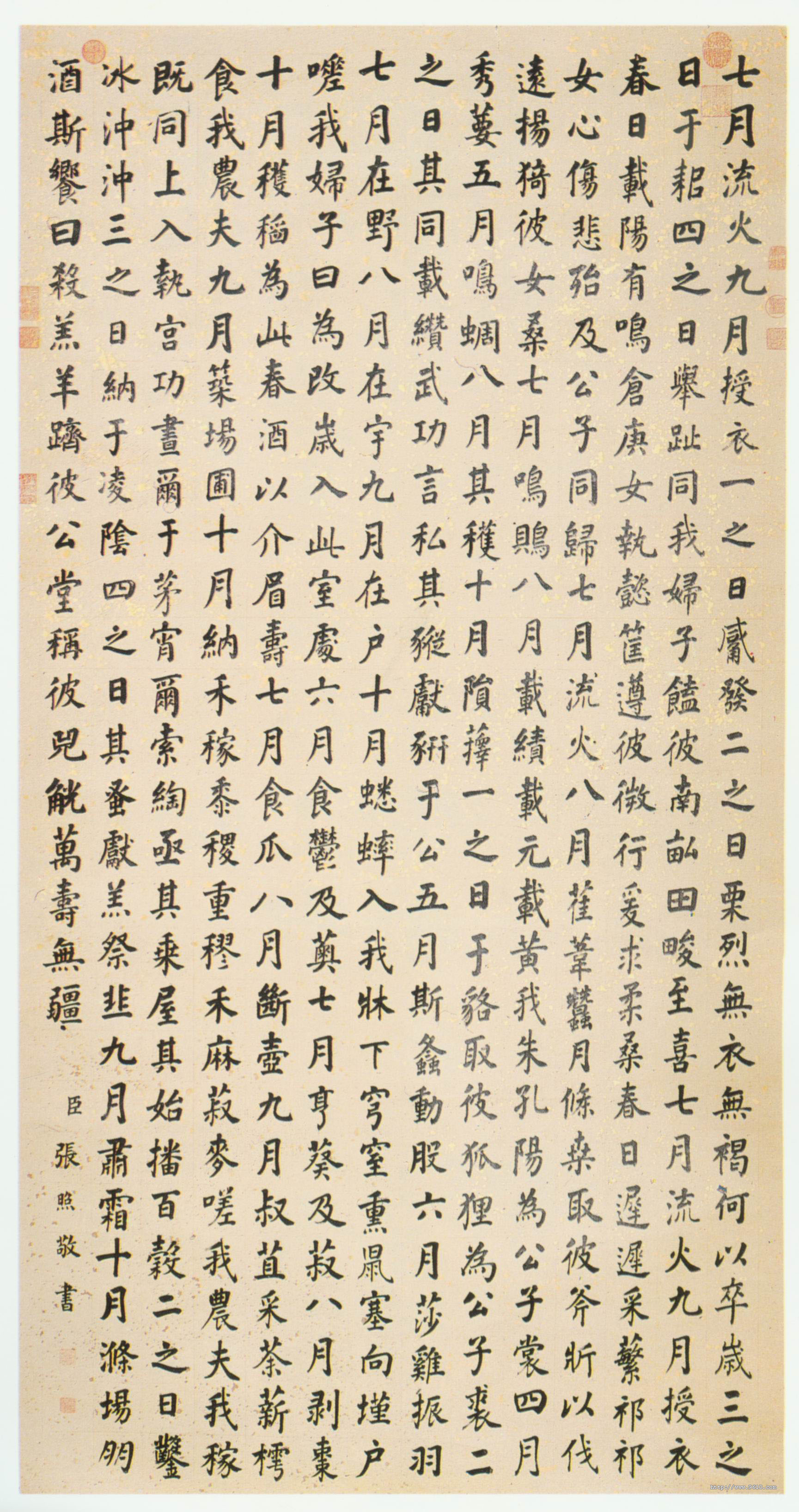 张照《楷书豳风七月轴 》金笺本 176.5×91.8cm 北京故宫博物院藏 释文:略 款署:臣张照敬书。 钤印:瀛海仙班(白文)、臣照(朱文)