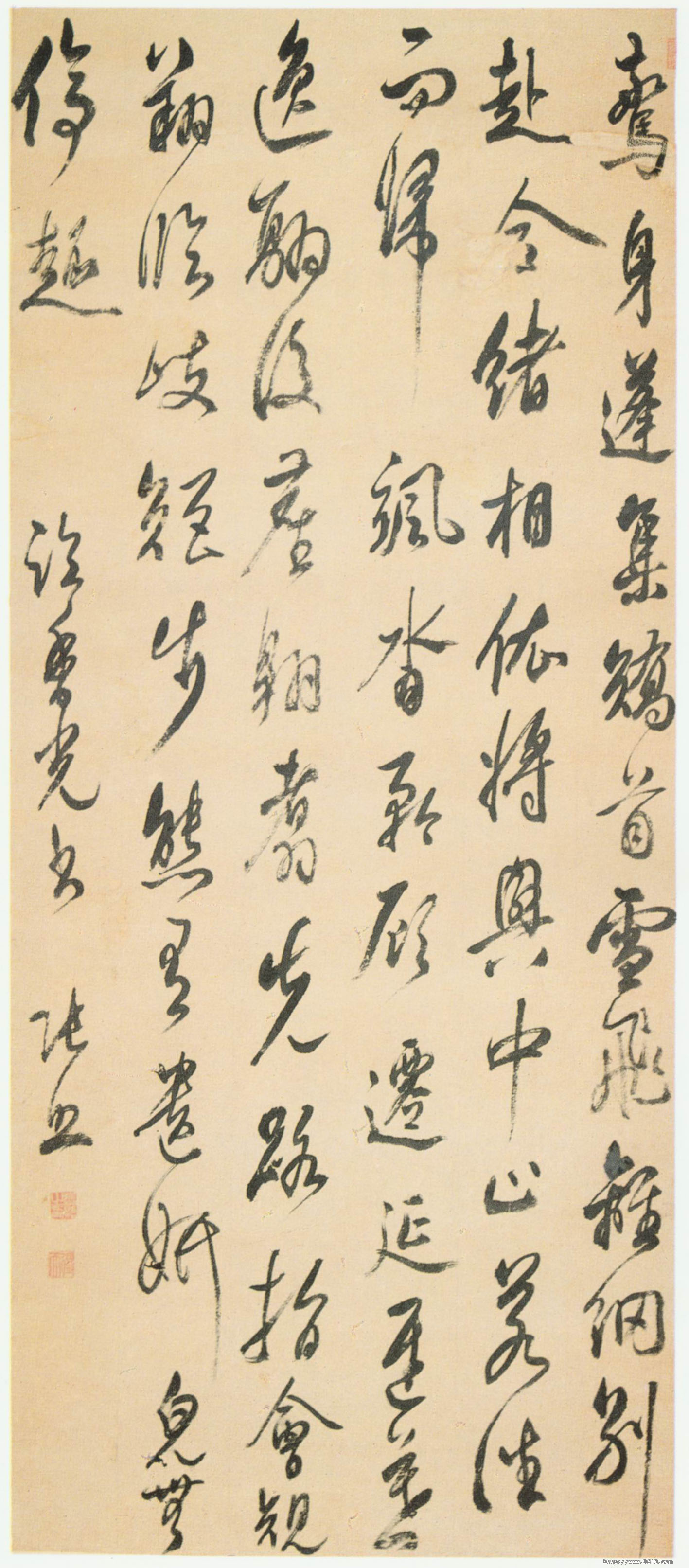 张照《临董其昌轴》纸本行草书 123×53cm 重庆市博物馆藏 释文:惊身蓬集,矫首雪飞。离纲别赴,合绪相依。将兴中止,若往而归。飒沓矜顾,迁延迟暮。逸翮后尘,翱翥先路。指会规翔,临岐矩步。态有遗妍,貌无停趣。 款署:临董香光书。张照。 钤印:张照之印(白文)、得天(朱文)。 【资料来源】《中国美术全集》书法篆刻编-6-清代书法(资料由可嘉提供)