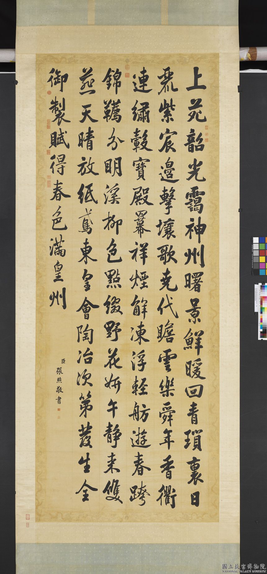 张照《御制赋得春色满皇州诗轴》纸本行书 340×133.5cm 台北故宫博物院藏 释文:上苑韶光靄。神州曙景鮮。暖回青瑣裡。日麗紫宸邊。擊壤歌堯代。瞻雲樂舜年。香衢連繡轂。寶殿羃祥煙。解凍浮輕舫。遊春跨錦韉。分明溪柳色。點綴野花妍。午靜來雙燕。天晴放紙鳶。東皇會陶冶。次第發生全。 款署:御製賦得春色滿皇州。臣張照敬書。 钤印:瀛海僊班、臣照