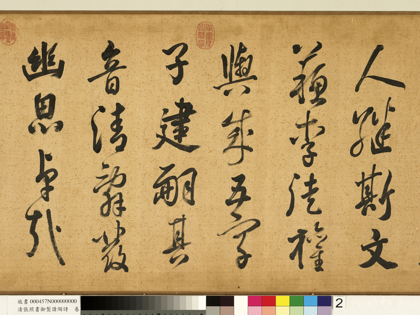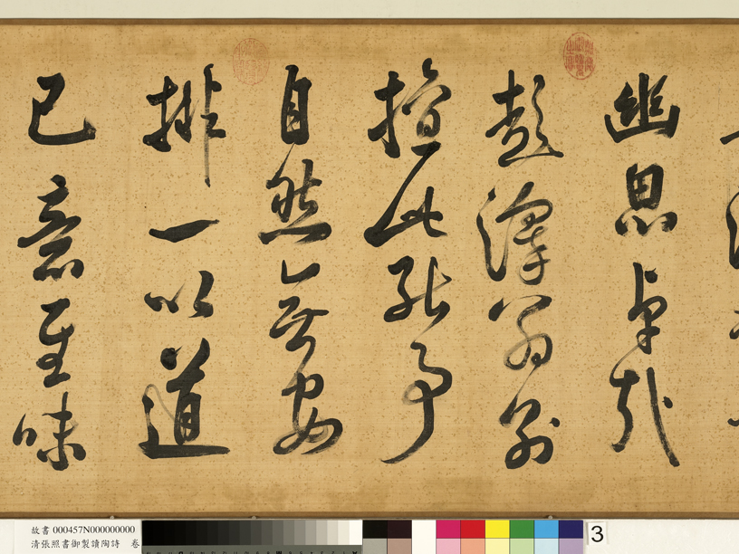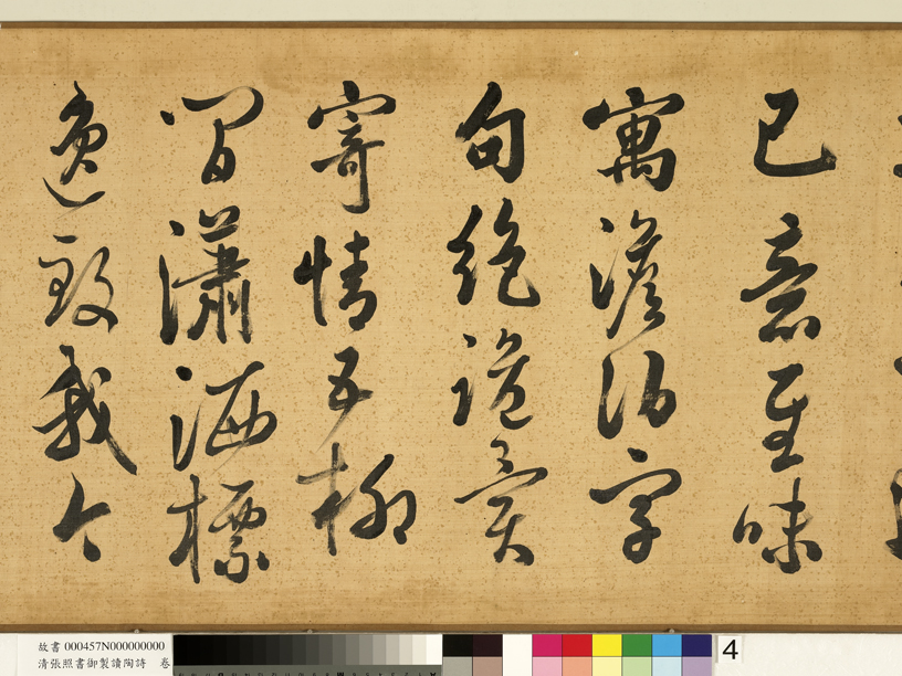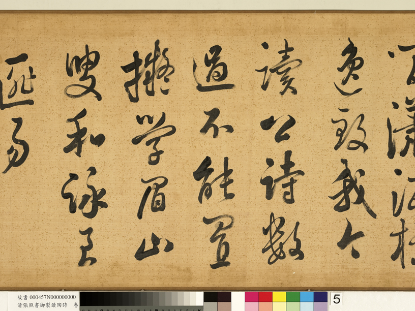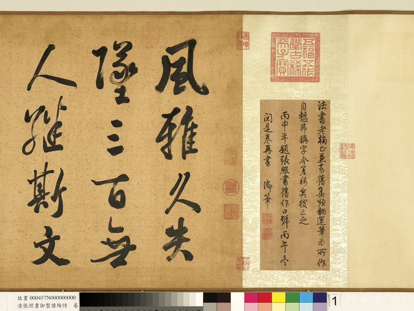 张照《书御制读陶诗卷》绢本行书 45×264.5cm 台北故宫博物院藏 释文:風雅久失墜。三百無人繼。斯文蘇李徒。權輿成五字。子建。嗣其音。清辭發幽思。卓哉彭澤翁。别擅此能事。自然無安排。一以道己意。至味寓澹泊。字句絶詭異。寄情五栁間。瀟洒標逸致。我今讀公詩。數過不能置。擬學眉山叟。和詠良匪易。 款署:御製讀陶詩。臣張照敬書。 钤印:瀛海僊班、臣照