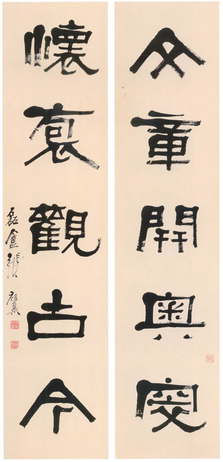 张祖翼《隶书文章怀抱五言联》纸本隶书 133.5×31.5cm×2 青岛市博物馆藏 释文:文章开奥窔,怀抱观古今。 款署:磊盫张祖翼。 钤印:张祖翼印(白文)等 【资料来源】《中国法书全集》-18-清-3 (可嘉扫描)