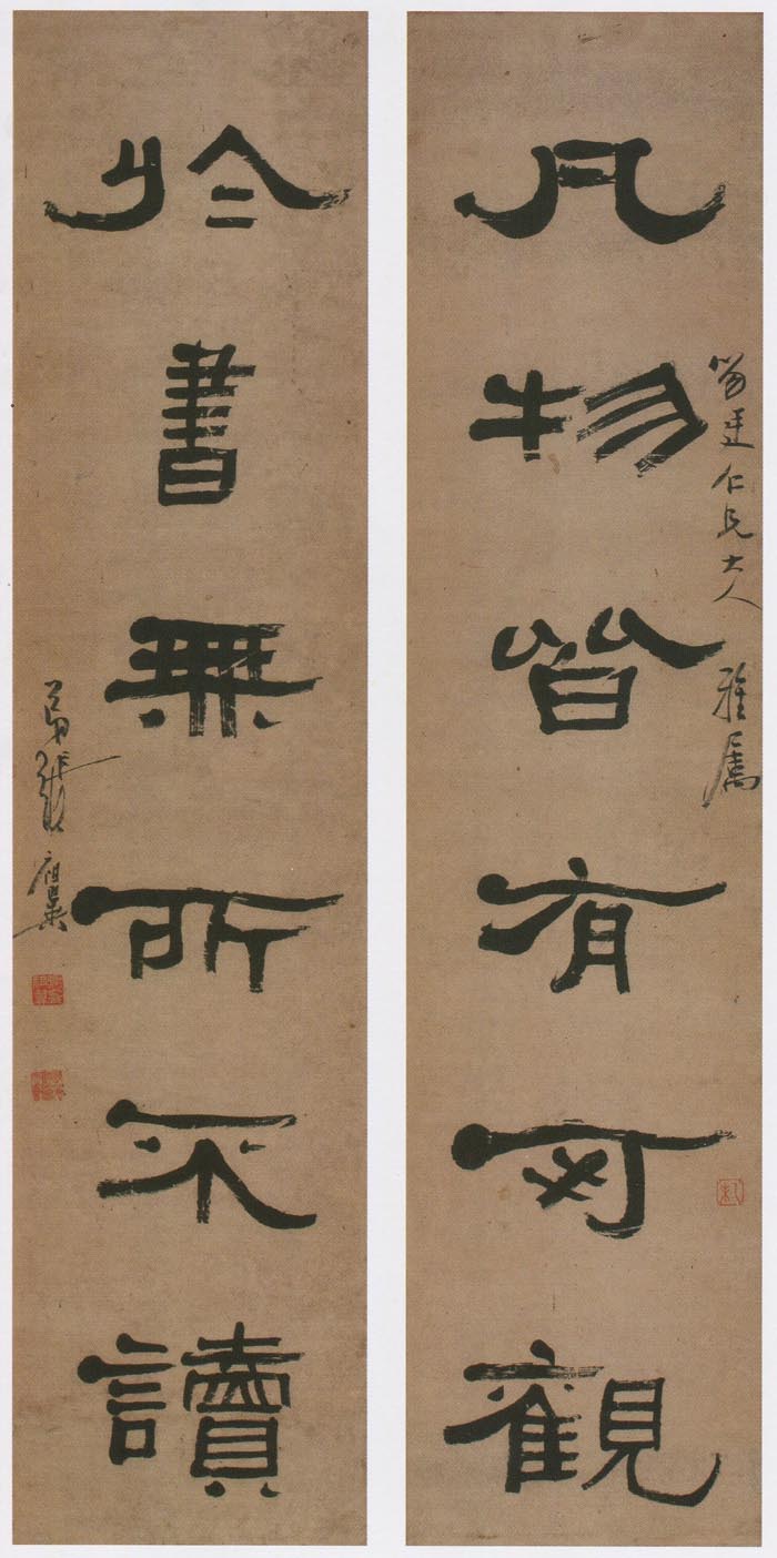 张祖翼《隶书凡物于书六言联》纸本隶书 120×28cm×2 淮安博物馆藏 释文:凡物皆有可观,于书无所不读。 款署:笏廷仁兄大人雅属,弟张祖翼。 【资料来源】《淮安市博物馆藏明清书画精品集 》 (文物出版社)