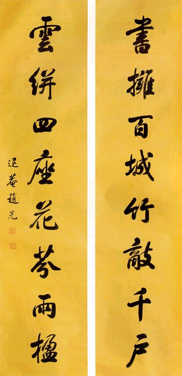 赵光《行书七言联》 云纹蜡笺,163.4×39cm×2