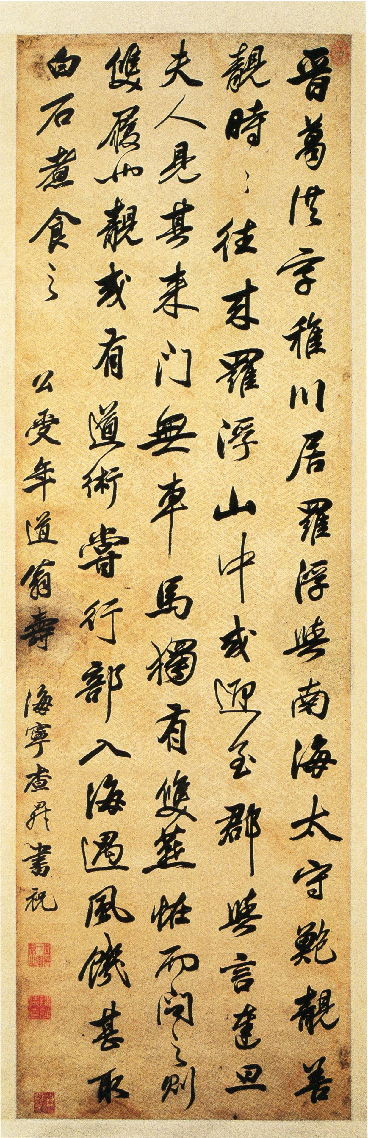 查昇《行书摘录罗浮图志轴 》绫本行书 141.8×42.5cm 湖南省博物馆藏 释文:晋葛洪,字稚川,居罗浮,与南海太守鲍靓善。靓时时往来山中,或迎至郡,与言达旦。夫人见其来,门无车马,独有双燕,怪而问之,则双履也。靓:“或有道术,尝行部入海,遇风饥甚,取白石煮食之。” 款署:公受年道翁寿。海宁查昇书祝。 钤印:查氏一字声山(朱文)、讲筵侍直(白文)。