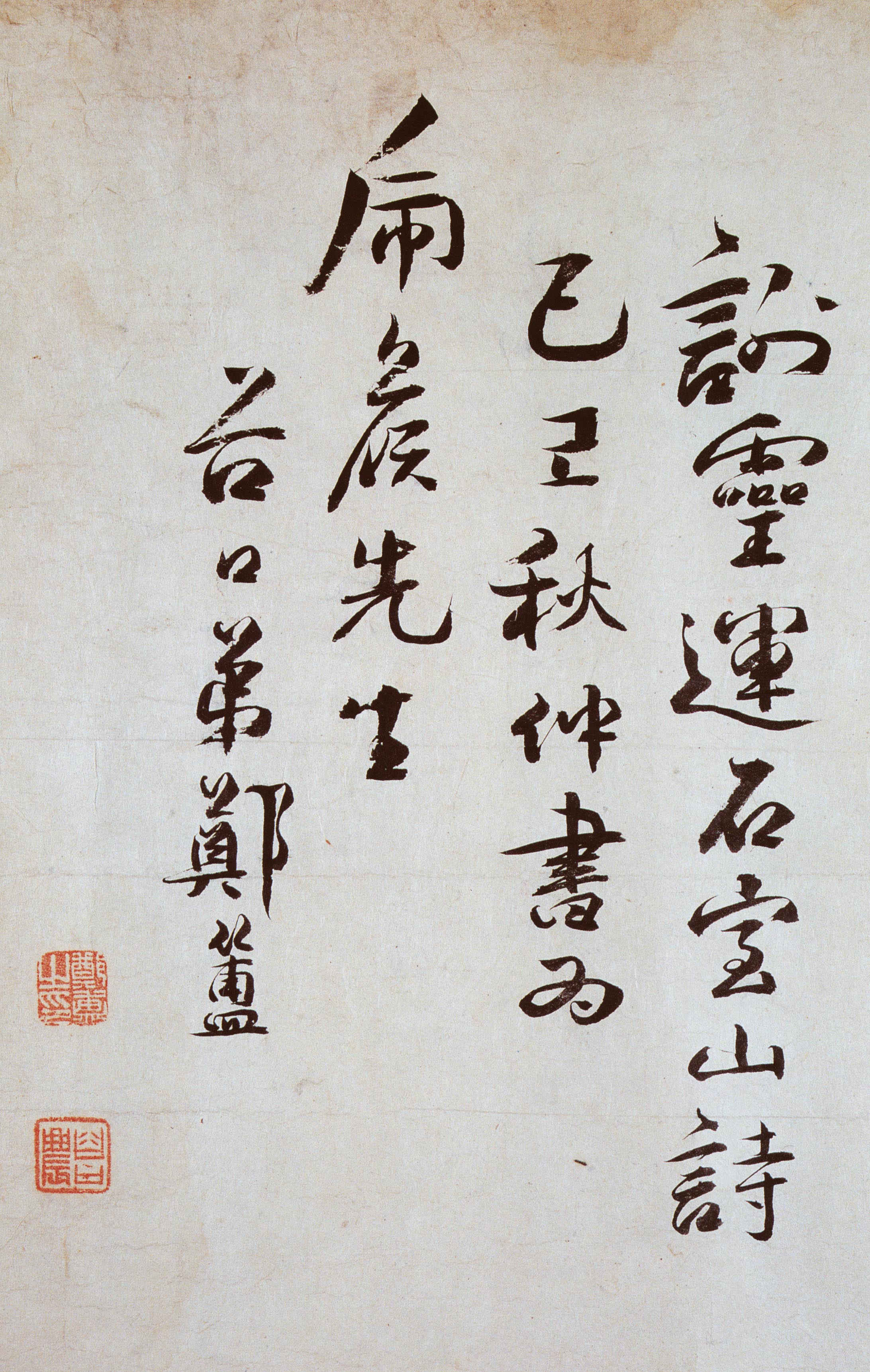 郑簠此册书法为纸本,纵三十九厘米,横二百 八十三厘米,用高丽笺阔罕纸,开卷右下角压钤 “立义行事”白文方印。隶书:“清旦索幽异,放 舟越坰郊,莓莓兰渚急,藐藐菭岭高,石室冠林陬, 飞泉发山椒,虚泛径千载,峥嵘非一朝,乡村绝闻 见,樵苏限风霄,微戎无远览,总笄羡升乔,灵域 久韬隐,如与心赏交,合欢不容言,摘芳弄寒条。” 又草书:“谢灵运《石室山诗》,己巳秋仲书为虎 侯先生,谷口弟郑簠。”钤“郑簠之印”白文方印、 “谷口农”朱文方印。