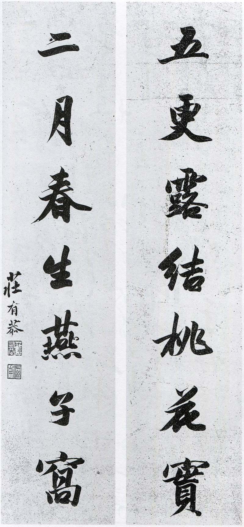 释文:五更露结桃花实,二月春生燕子窝。 款署:庄有恭 钤印:庄有恭印(白文)、滋甫(朱文) 【资料来源】《广东历代书法图录》(广东人民出版社)
