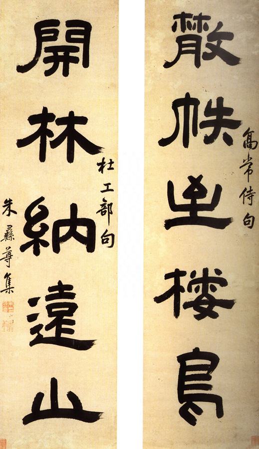 朱彝尊《隶书散帙开林五言联》 104.9×27cm×2 台北故宫博物院藏 释文:散帙至栖鸟,开林纳远山。 款署:高常侍句、杜工部句。朱彝尊集。 钤印:朱彝尊印(白文)、竹垞(朱文)。