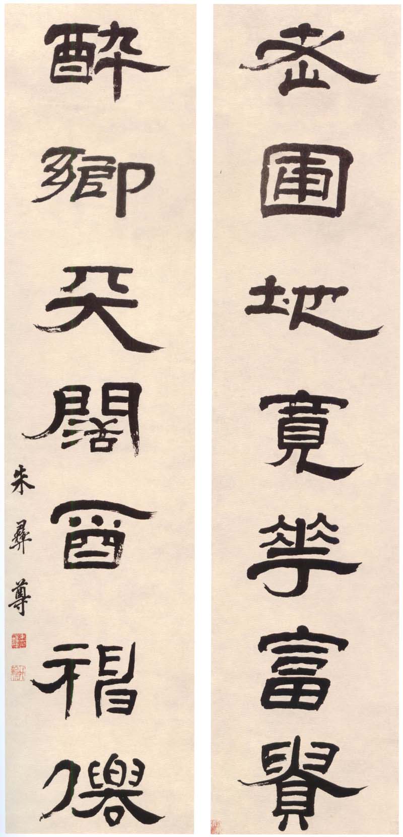 朱彝尊《隶书老圃醉乡七言联》纸本隶书 124×29cm×2 沈阳故宫博物院藏 释文:老圃地宽花富贵,醉乡天阔酒神仙。 款署:朱彝尊。 钤印:朱彝尊印(白文)、竹垞(朱文)。