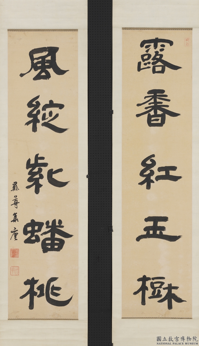 朱彝尊《隶书露香风绽五言联》纸本隶书 113.2×27.6cm×2 台北故宫博物院藏 释文:露香红玉树。风绽紫蟠桃。 款署:彝尊集唐。 钤印:朱彝尊印(白文)、竹垞(朱文)、 醧舫。