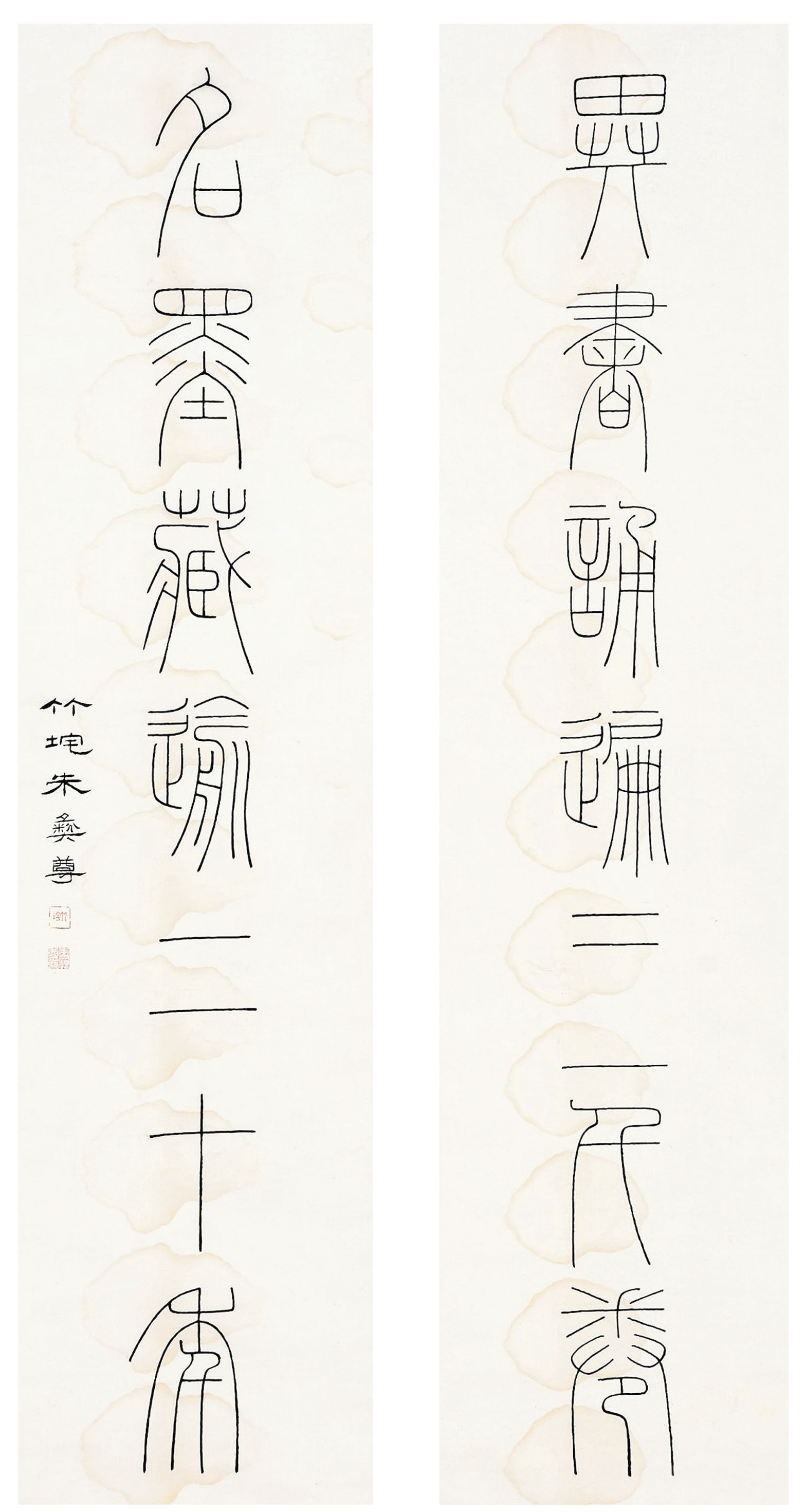 朱彝尊《篆书异书名墨七言联》纸本篆书 释文:异书诵遍三千卷,名墨藏逾二十年。 款署:竹坨朱彝尊。 钤印:朱彝尊印(白文)、竹垞(朱文)