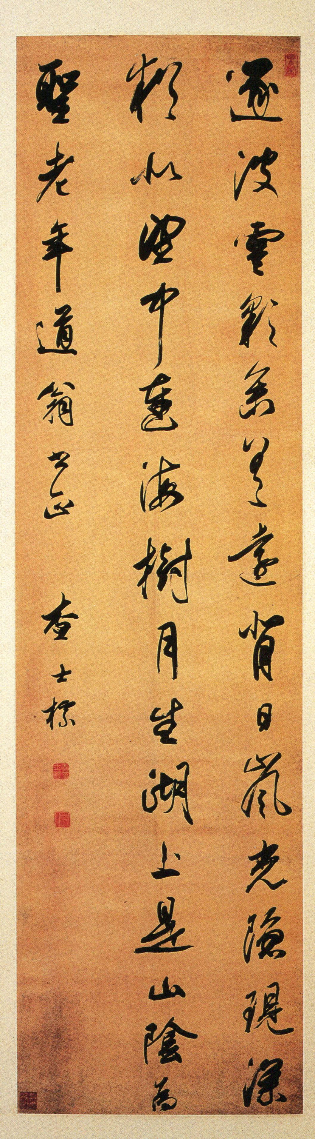 查士标《行书录李绅诗轴》绫本行书 173×45.7cm 湖南省博物馆 释文:逐波雲彩参差远,背日岚光隐现深。犹似望中连海树,月生湖上是山阴。 款署:为圣老年道翁书正。査士标。 钤印:査士标印、二瞻氏。