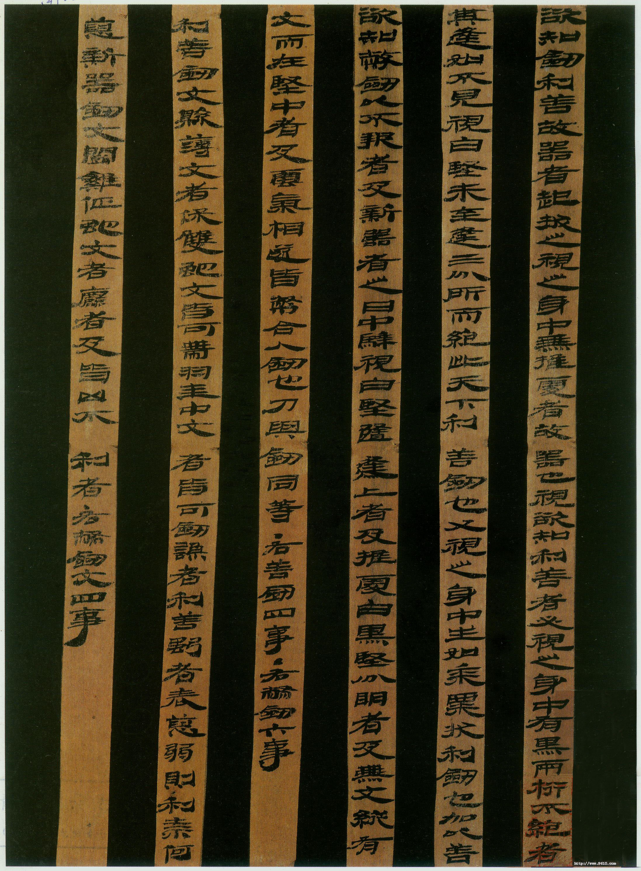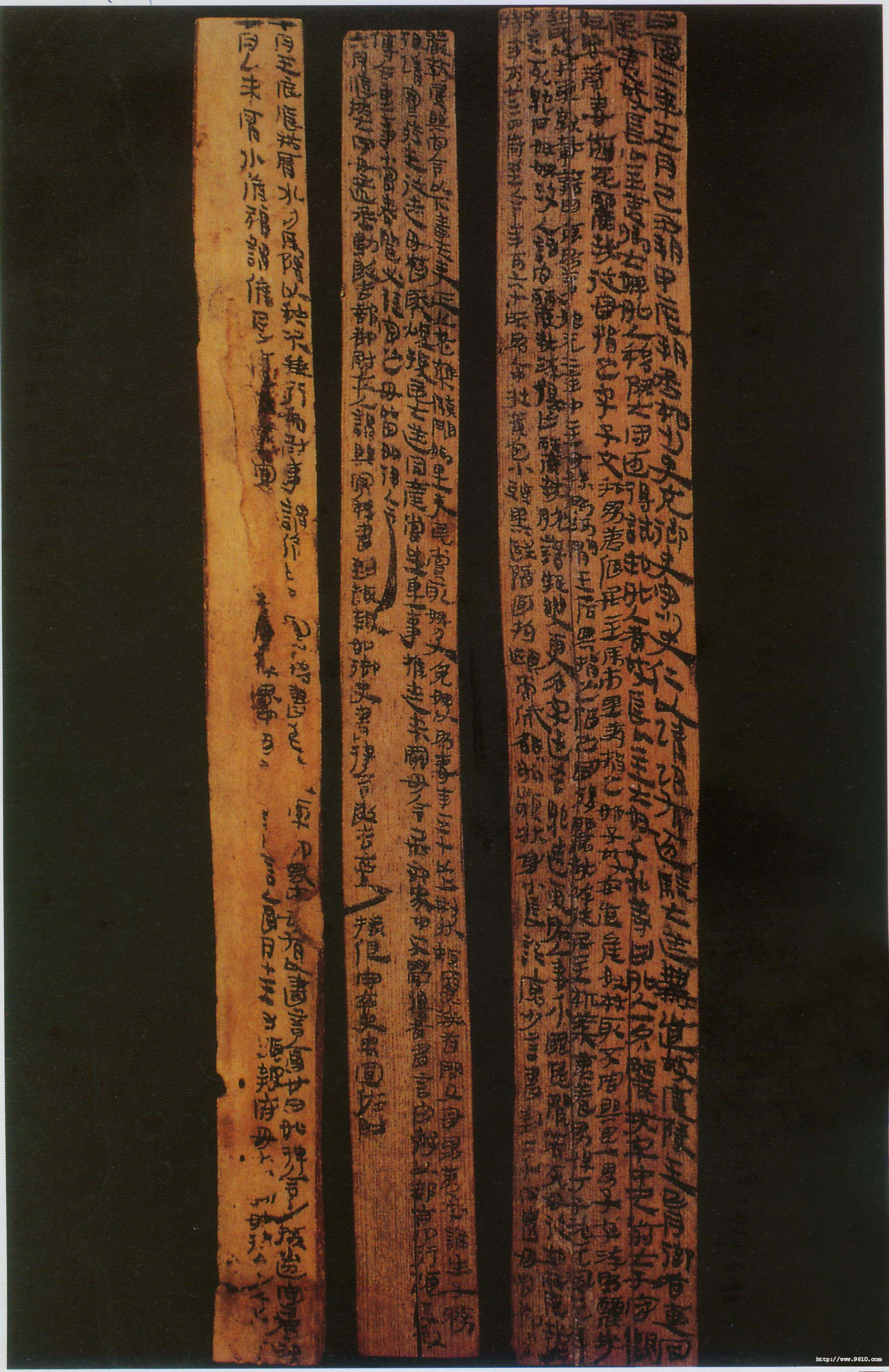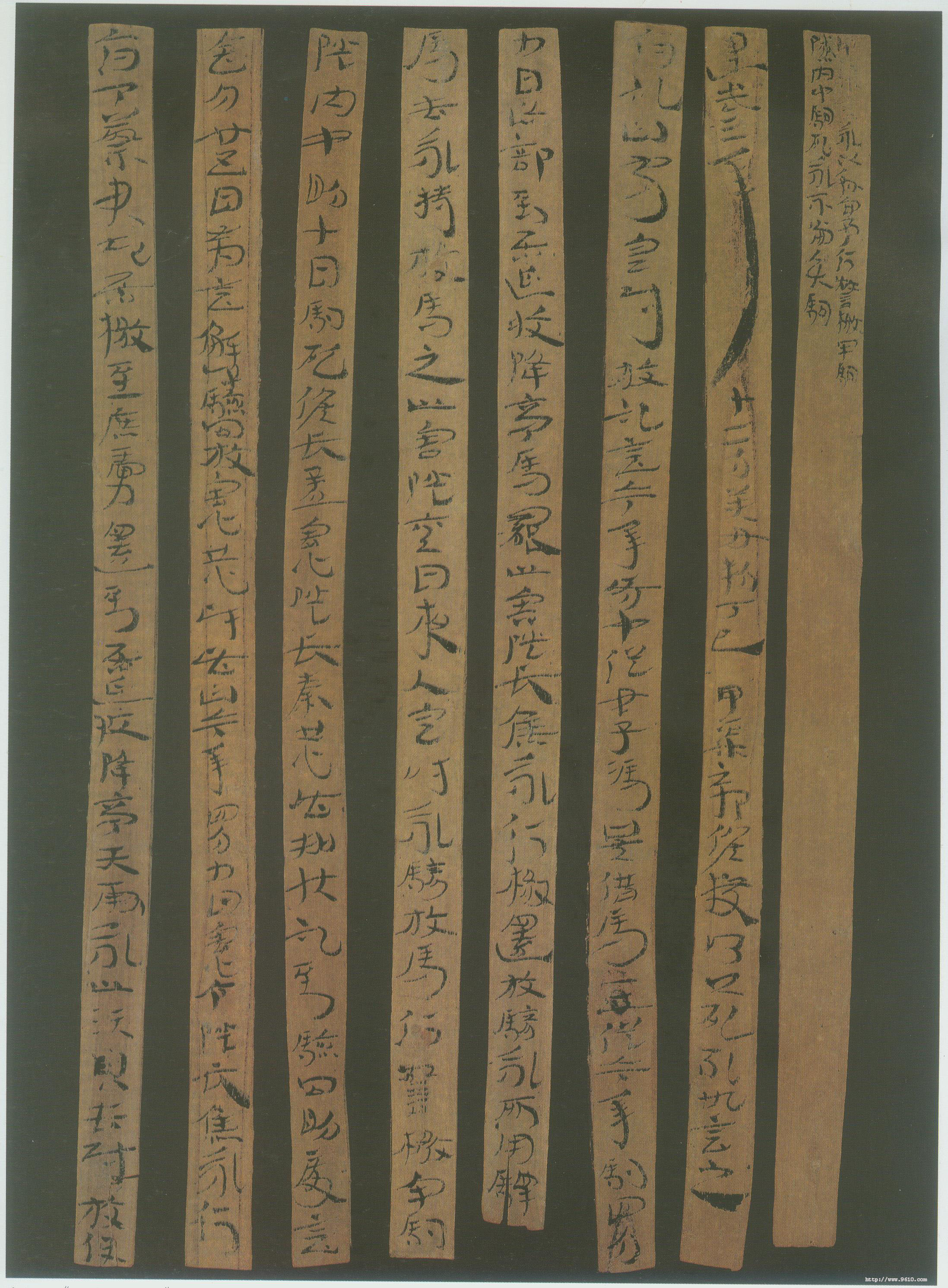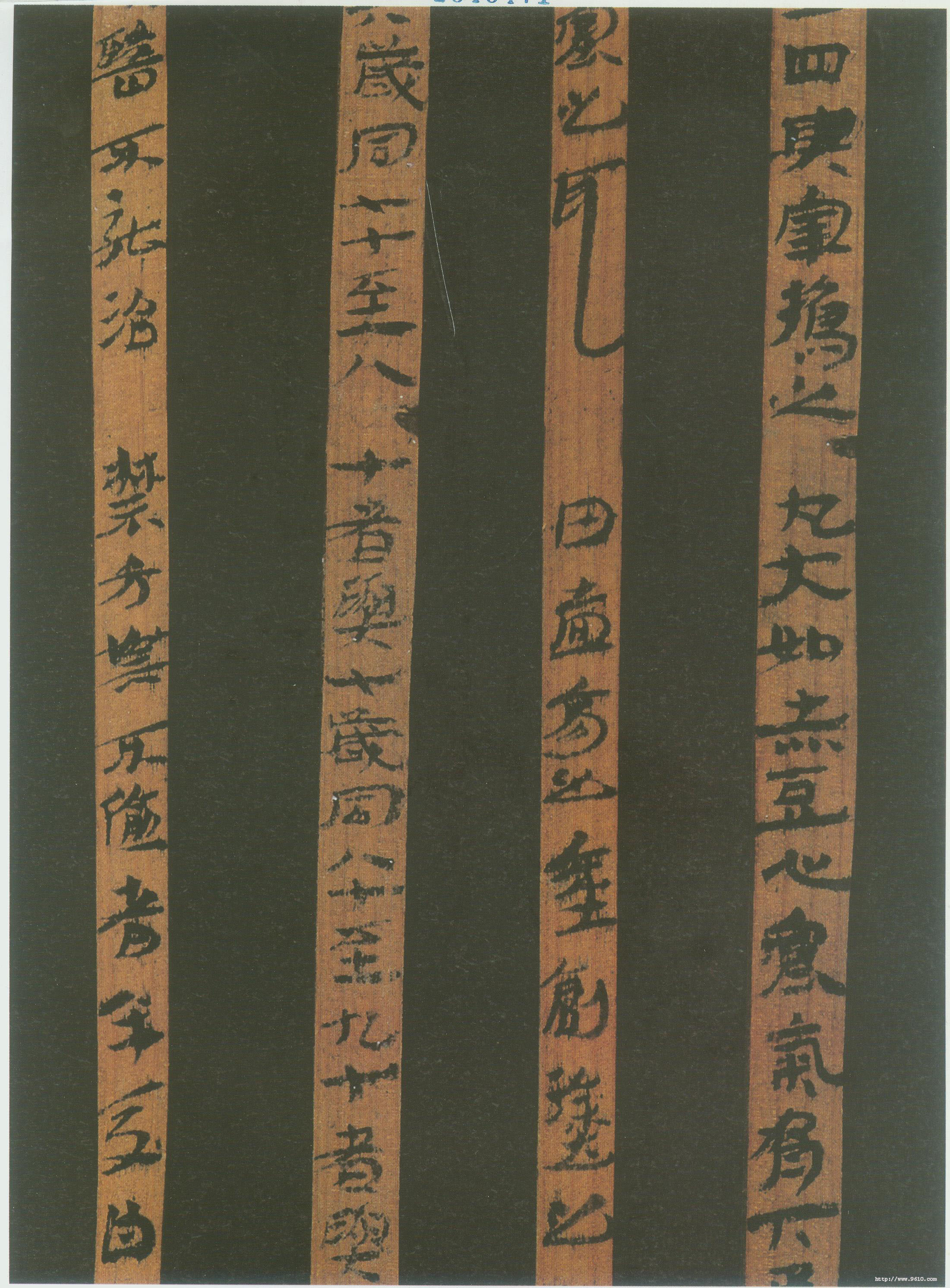 一九八六年,甘肃文物考古研究所在天水市北道区放马滩古墓群中的一号墓中发现竹简四八○余枚。竹简浸泡在棺液中朽腐严重,已发黑色,简文字体漫漶。竹简有二种形制,甲种长二十七点五厘米,宽○点七厘米;乙种长二十三厘米,宽○点六厘米。