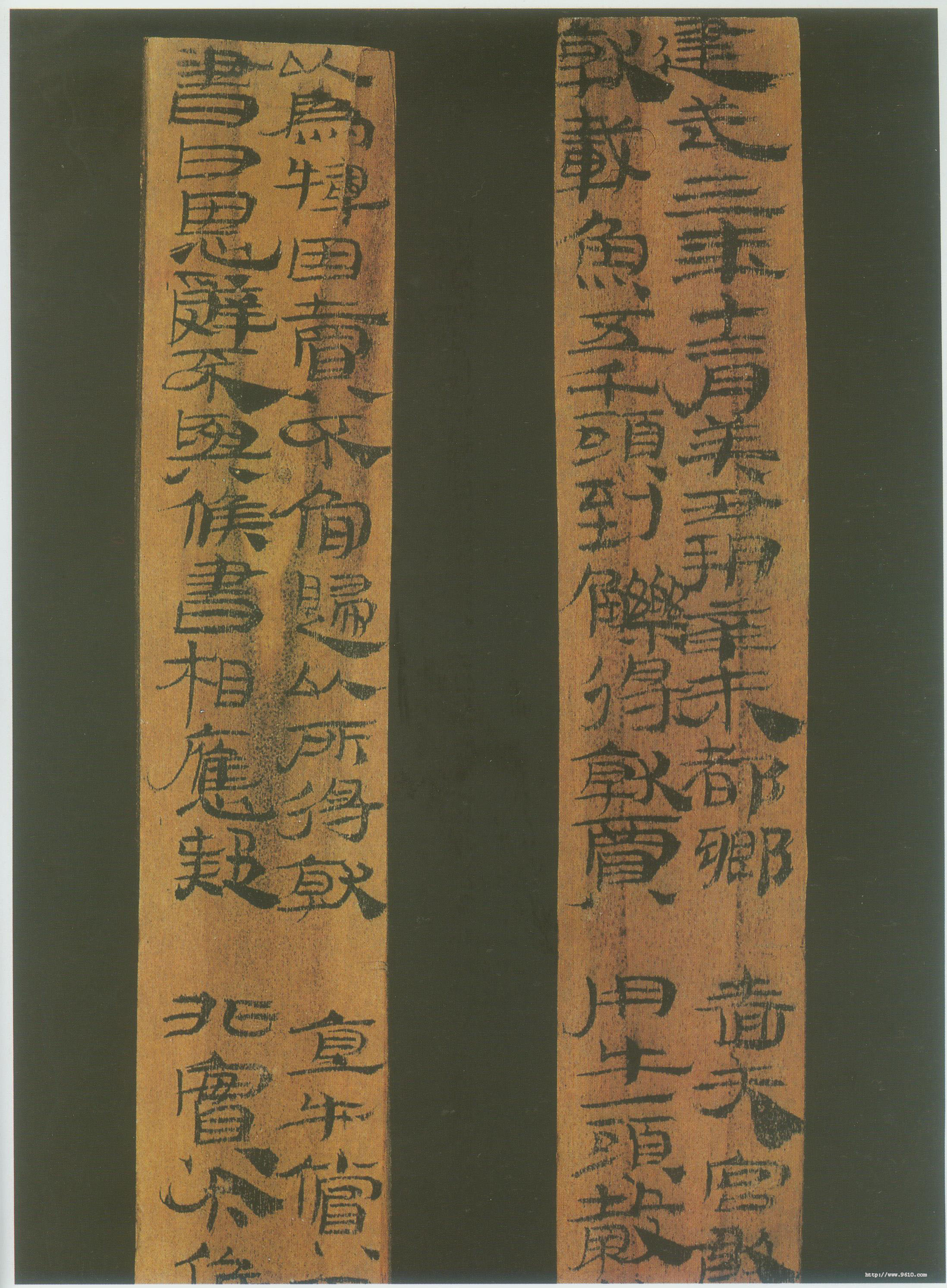一九七一年,甘肃省博物馆在甘谷县汉墓中发现二十三枚木简。简长二十三、宽二点六厘米,松木制作,每简书两行,背面上端编写顺序号,连编成册后书写。简文整齐分为三节,可清楚地辨认出整齐秀丽的八分体字,但是大部分简牍已朽碎。
